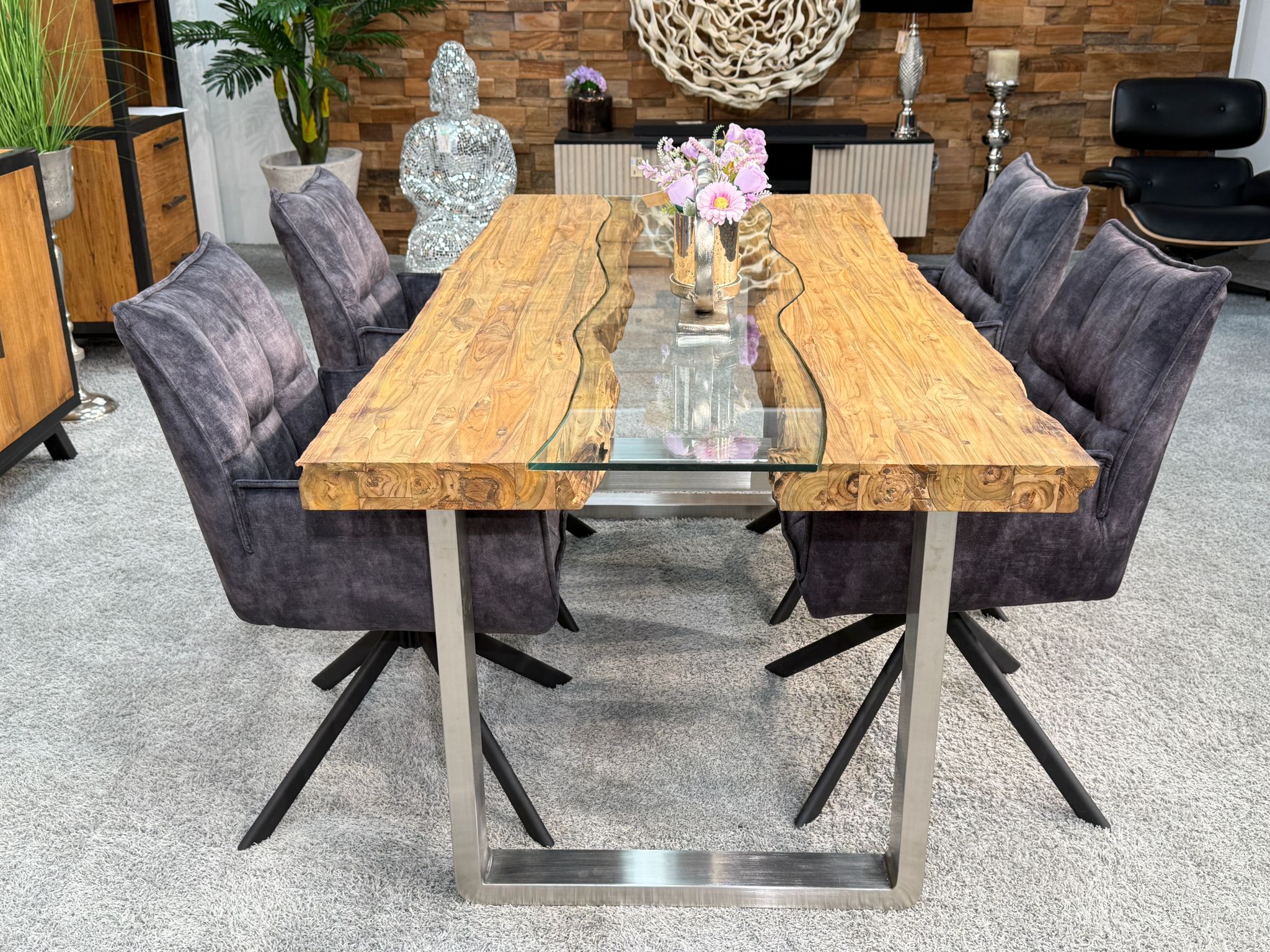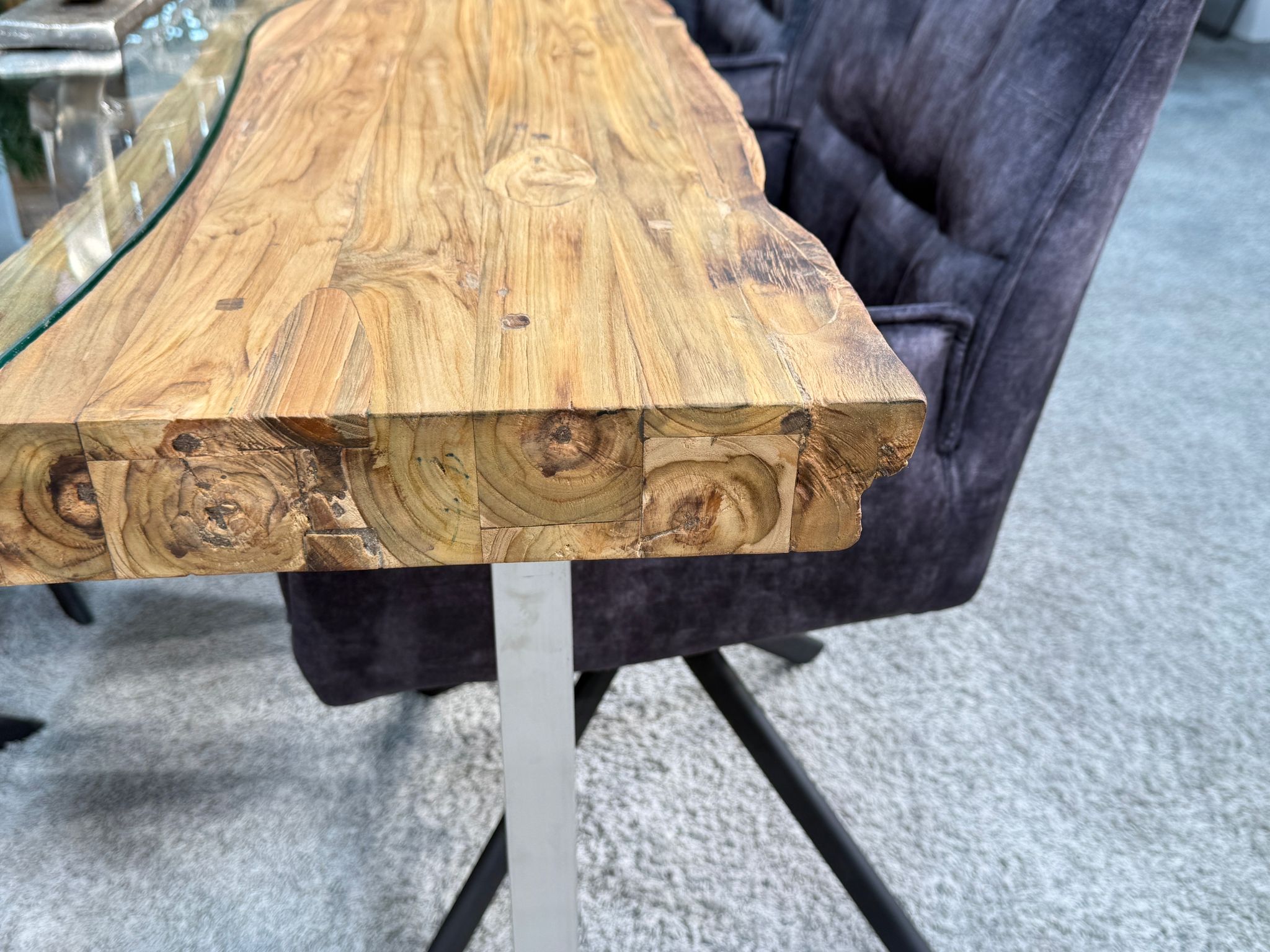 Esstisch "Old Elements" mit Glaseinlage ca. 180 x 90 x 78 cm aus recycelten Teakholzbohlen und Edelstahlgestell