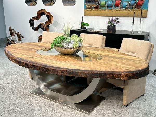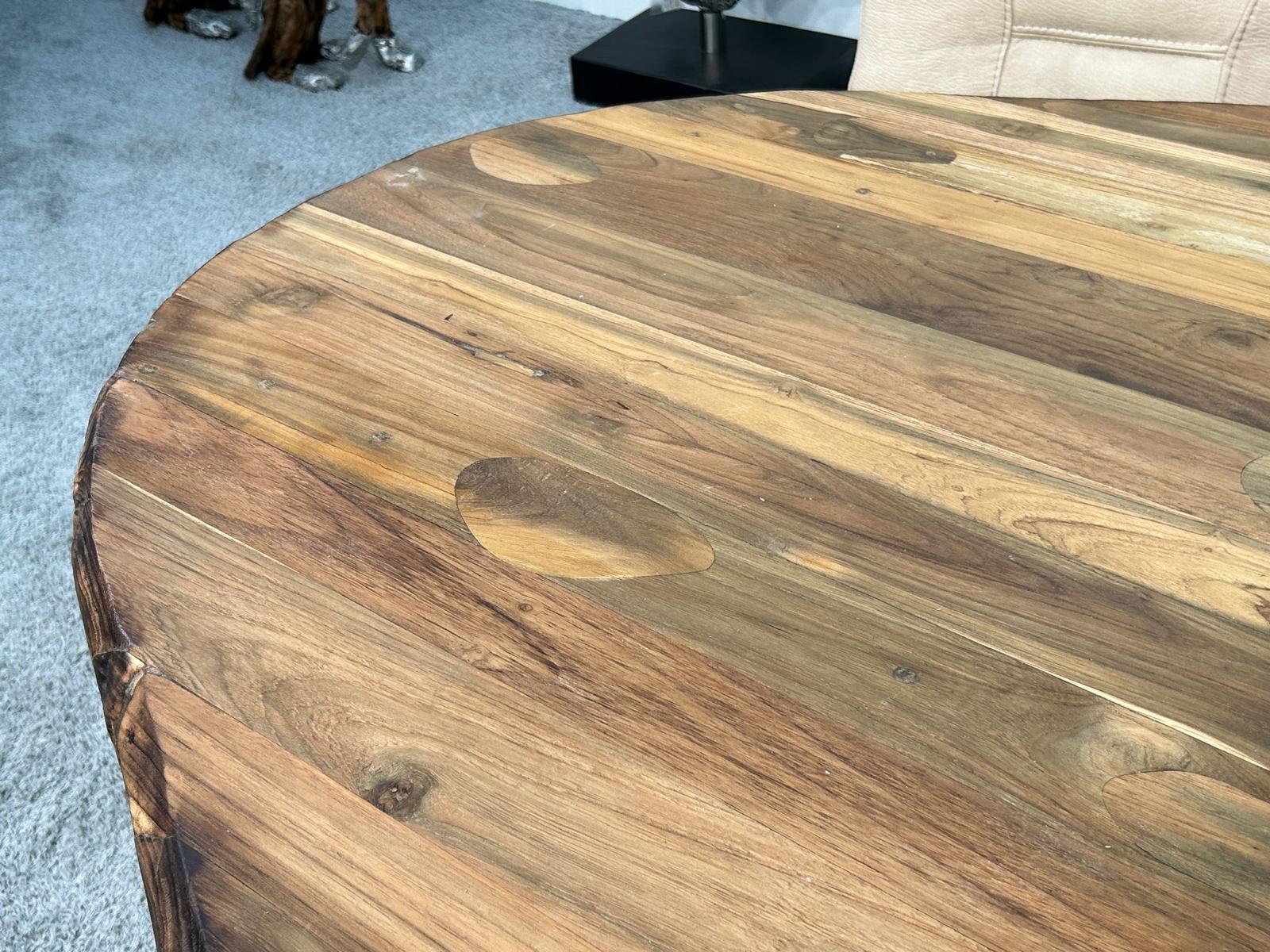 Die 9,5 cm massive Tischplatte besteht aus verleimten Massivholzbohlen alter Häuser der Inseln Java und Bali. Durch seine ovale Form uns seiner Länge von 254 cm bietet dieser Esstisch ausreichend Platz für 8–10 Personen. Aufgrund seiner außergewöhnlichen Größe ist dieser Tisch ebenfalls als Konferenztisch im Büro und im Besprechungsraum einsetzbar. Die Oberfläche der massiven Tischplatte ist leicht gebürstet und mit einem hochwertigen Möbelwachs versiegelt. Der Tischfuß in Form eines Halsmondes, der selbstverständlich auch in reiner Handarbeit gefertigt wurde, besteht aus gebürstetem Edelstahl.