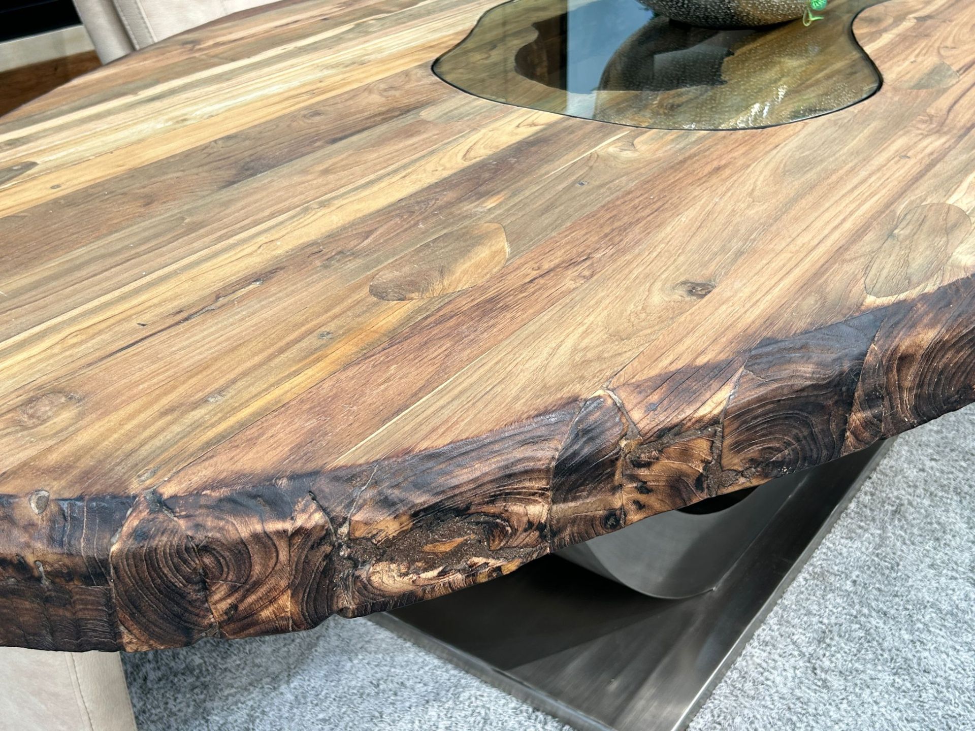 Materialien: Recyceltes Altholz (Teak), Tischgestell aus Edelstahl gebürstet, Glaseinlage