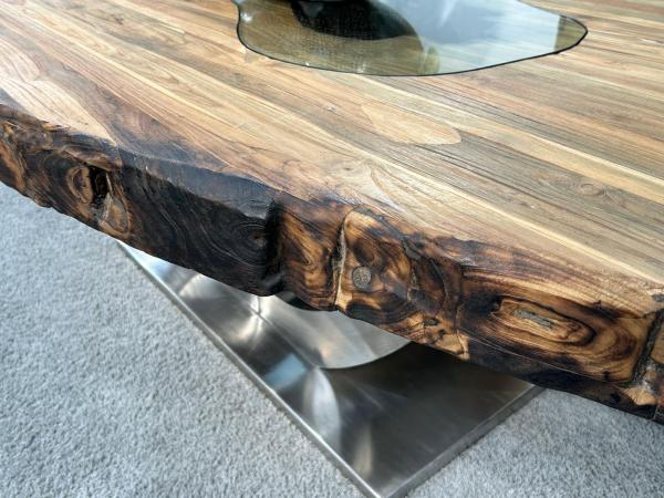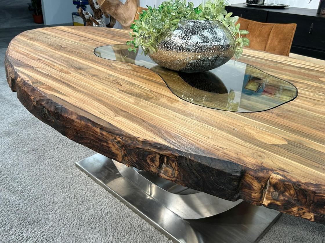 Materialien: Recyceltes Altholz (Teak), Tischgestell aus Edelstahl gebürstet, Glaseinlage