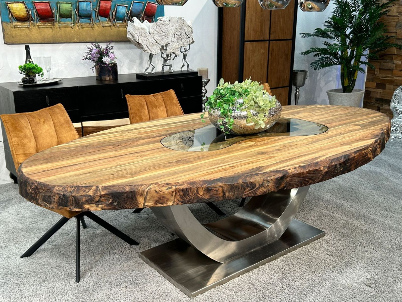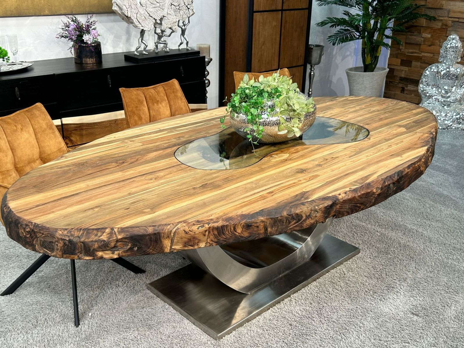 Schon allein die Auswahl der Rohmaterialien macht diesen ovalen Esstisch der Serie "Sky Island" zu einer Besonderheit.