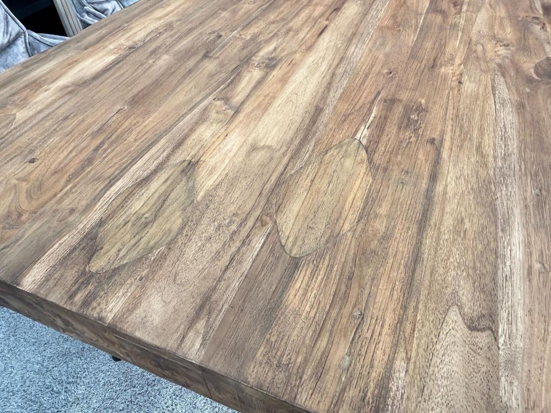 Die Oberfläche der Tischplatte erzählt eine Geschichte: Natürliche Gebrauchsspuren wie alte Nagellöcher, Holzzapfen oder Vertiefungen wurden in aufwendiger Handarbeit mit ergänzenden Holzstücken versehen. Diese Details unterstreichen den rustikalen Charakter des recycelten Teakholzes und machen jeden Tisch zu einem Unikat.