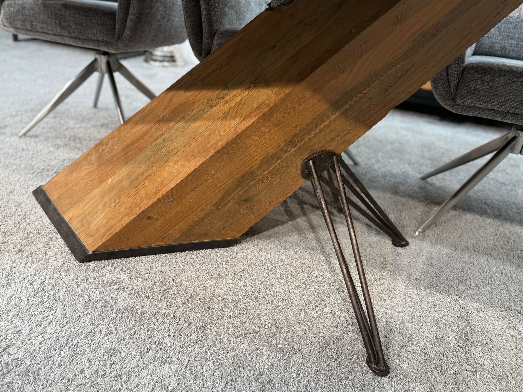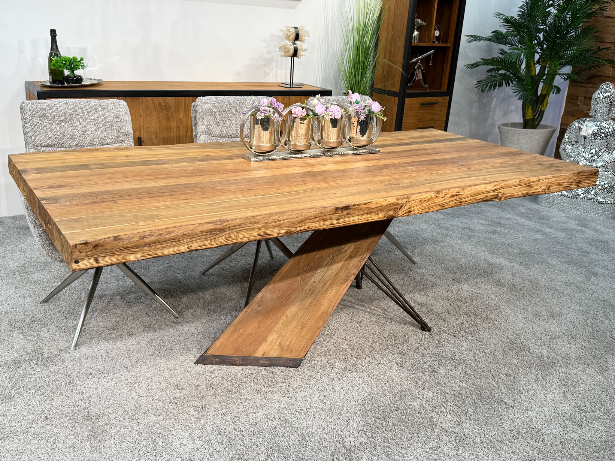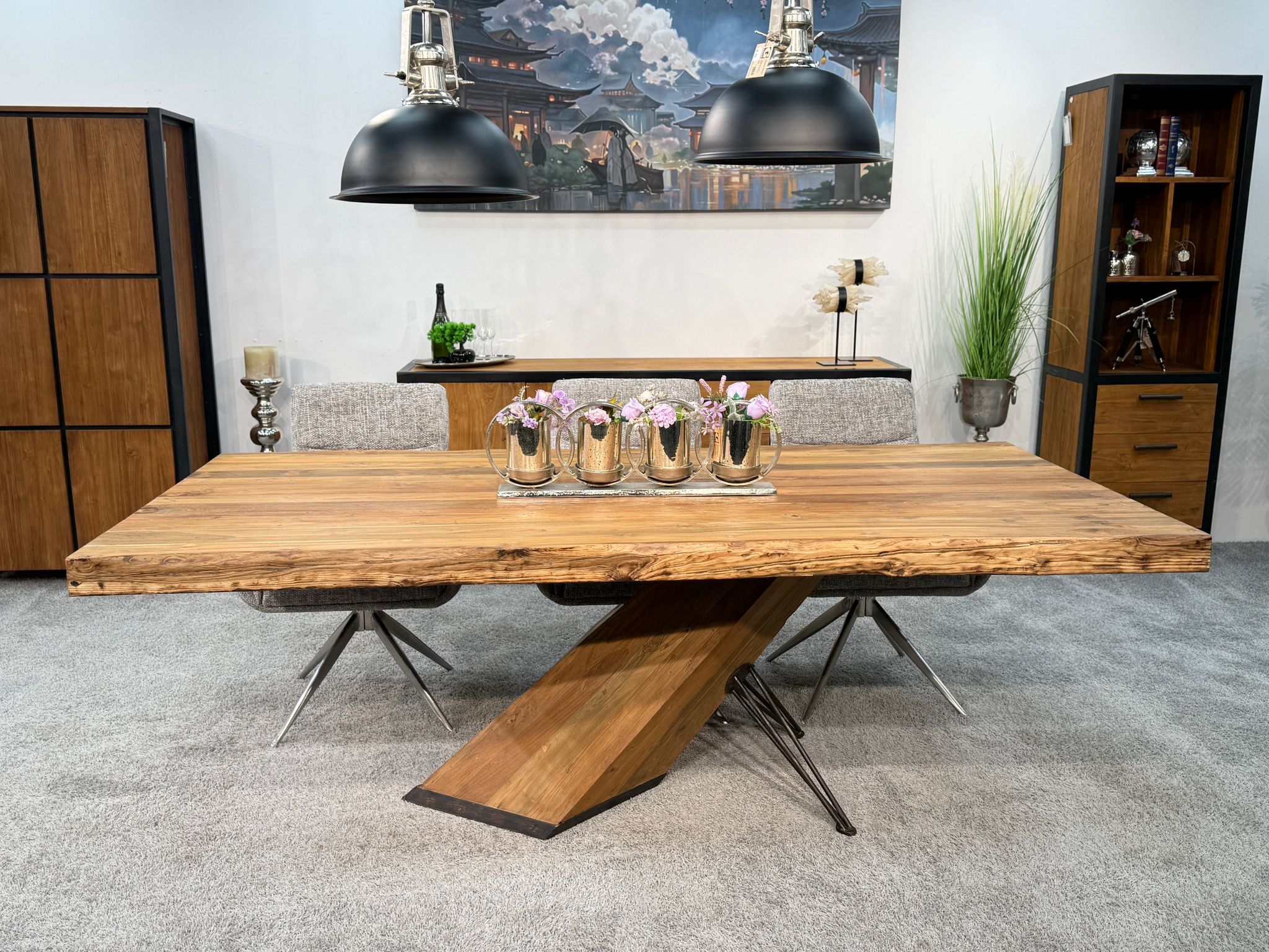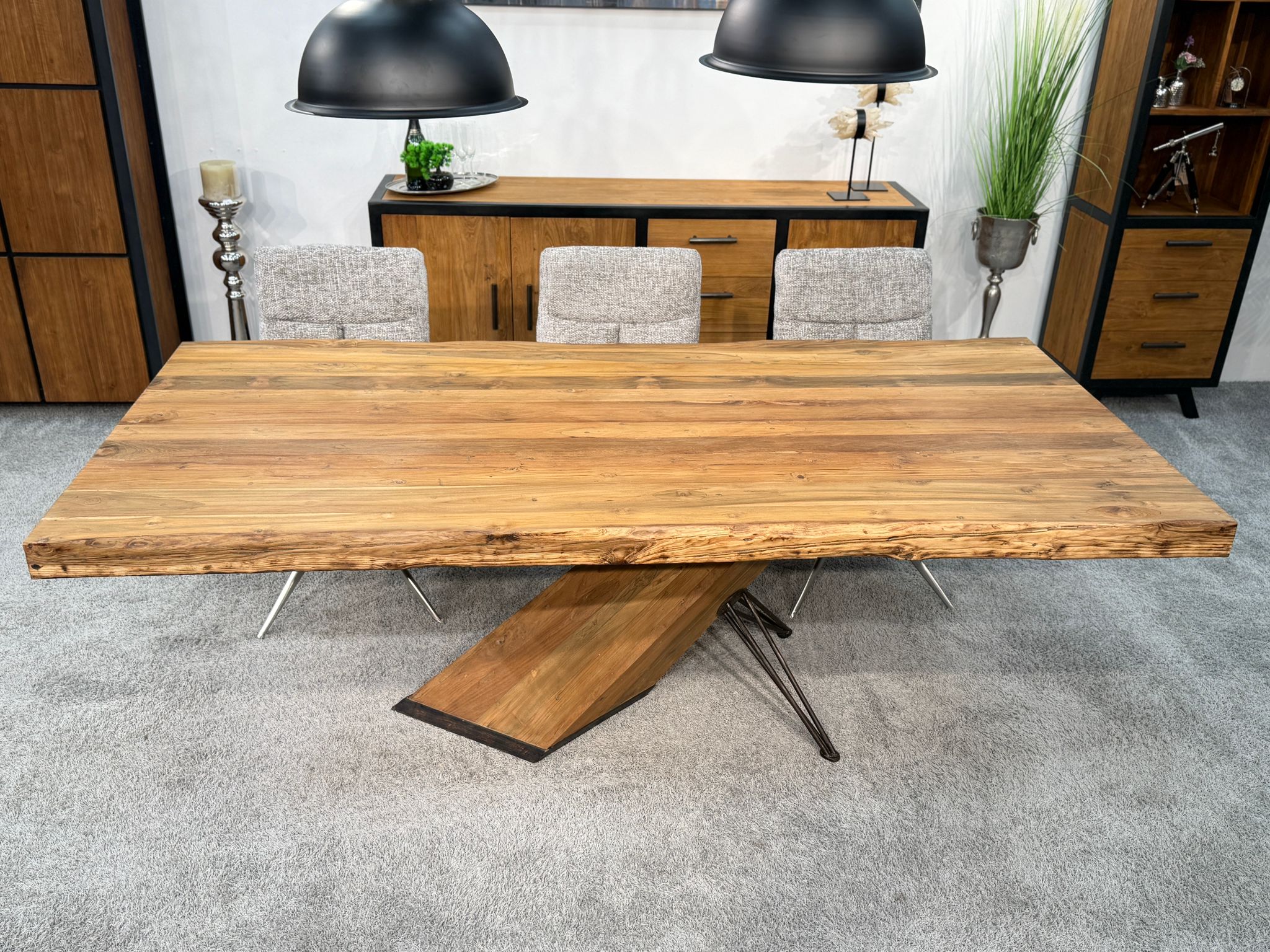 Esstisch / Massivholztisch ca. 220 x 103 x 78 cm "Deep Island Leaning Leg" aus recyceltem Altholz mit einem geneigten Teakholzgestell