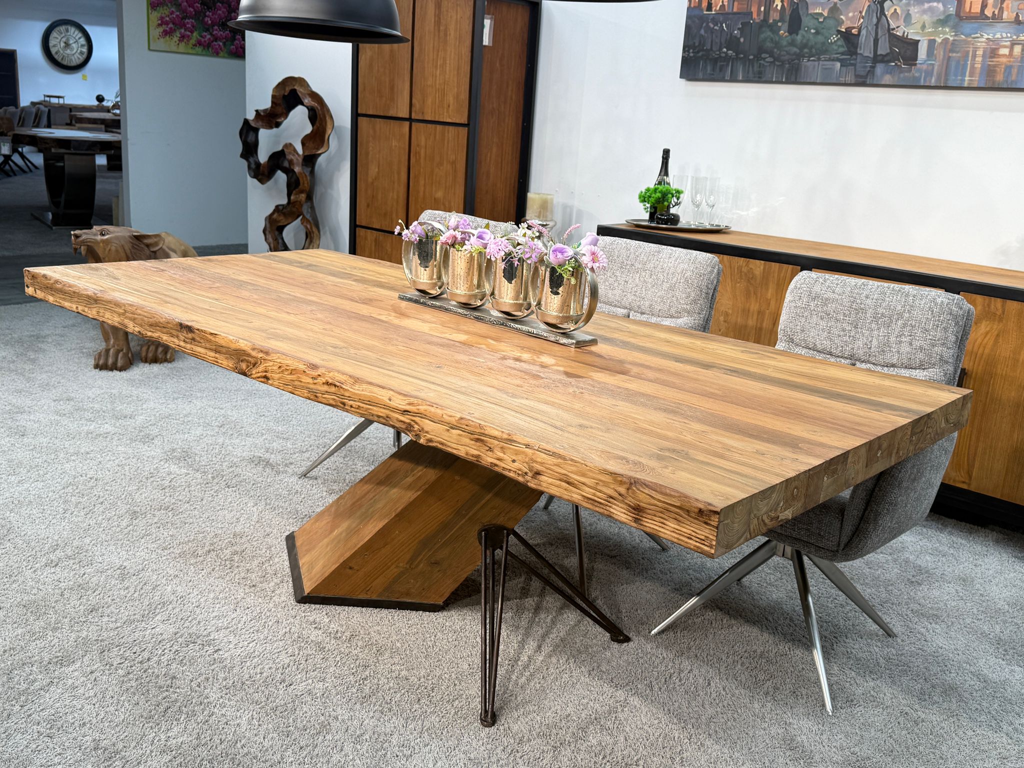In reiner Handarbeit gefertigter Tisch aus verleimten Massivholzbohlen mit einer massiven Plattenstärke von 7,5 cm.