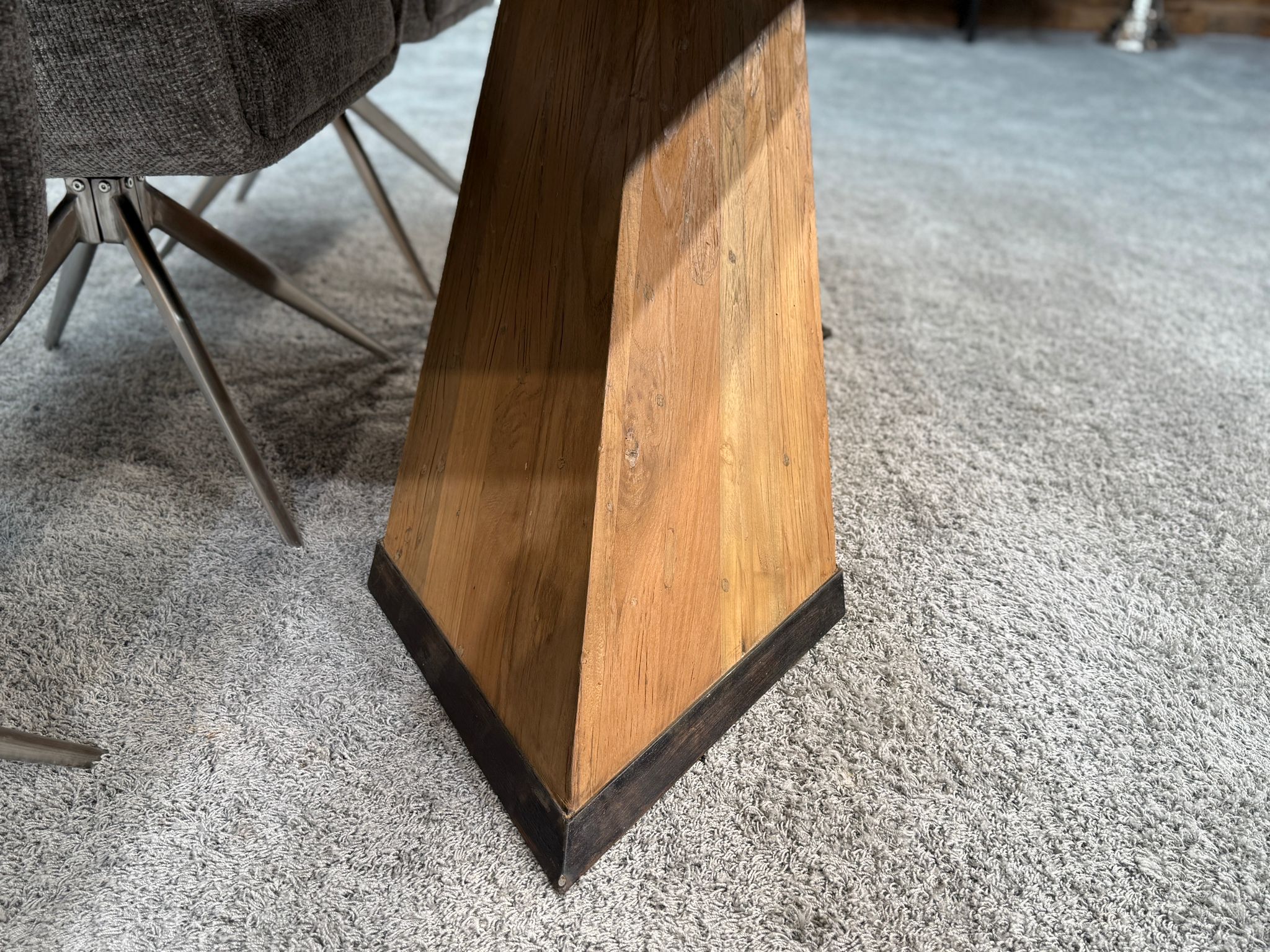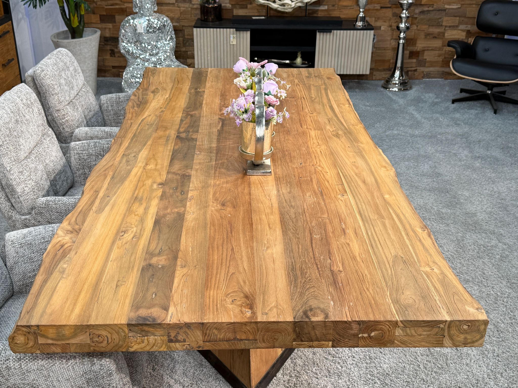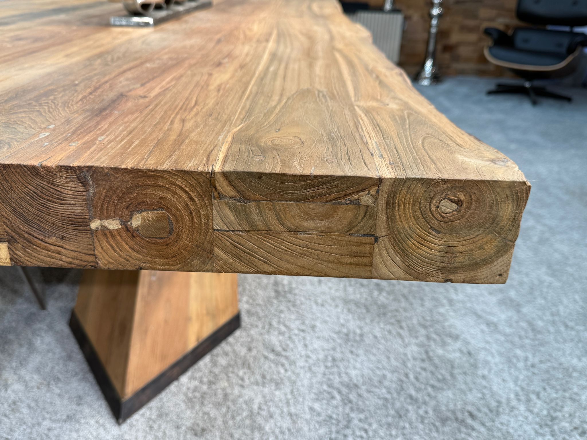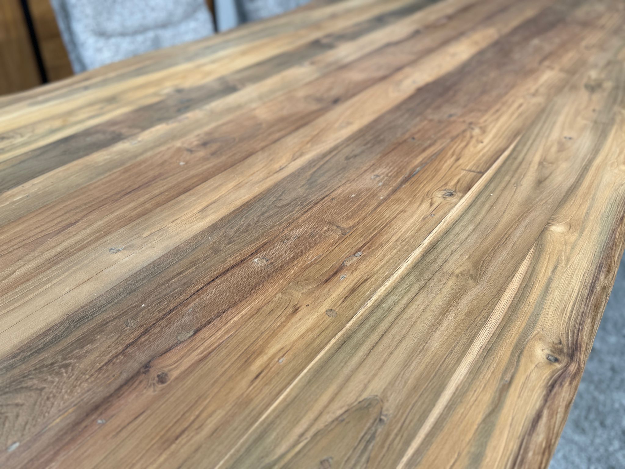 Materialien: Recyceltes Altholz (Teak), Tischgestell aus Teakholz und Stahl