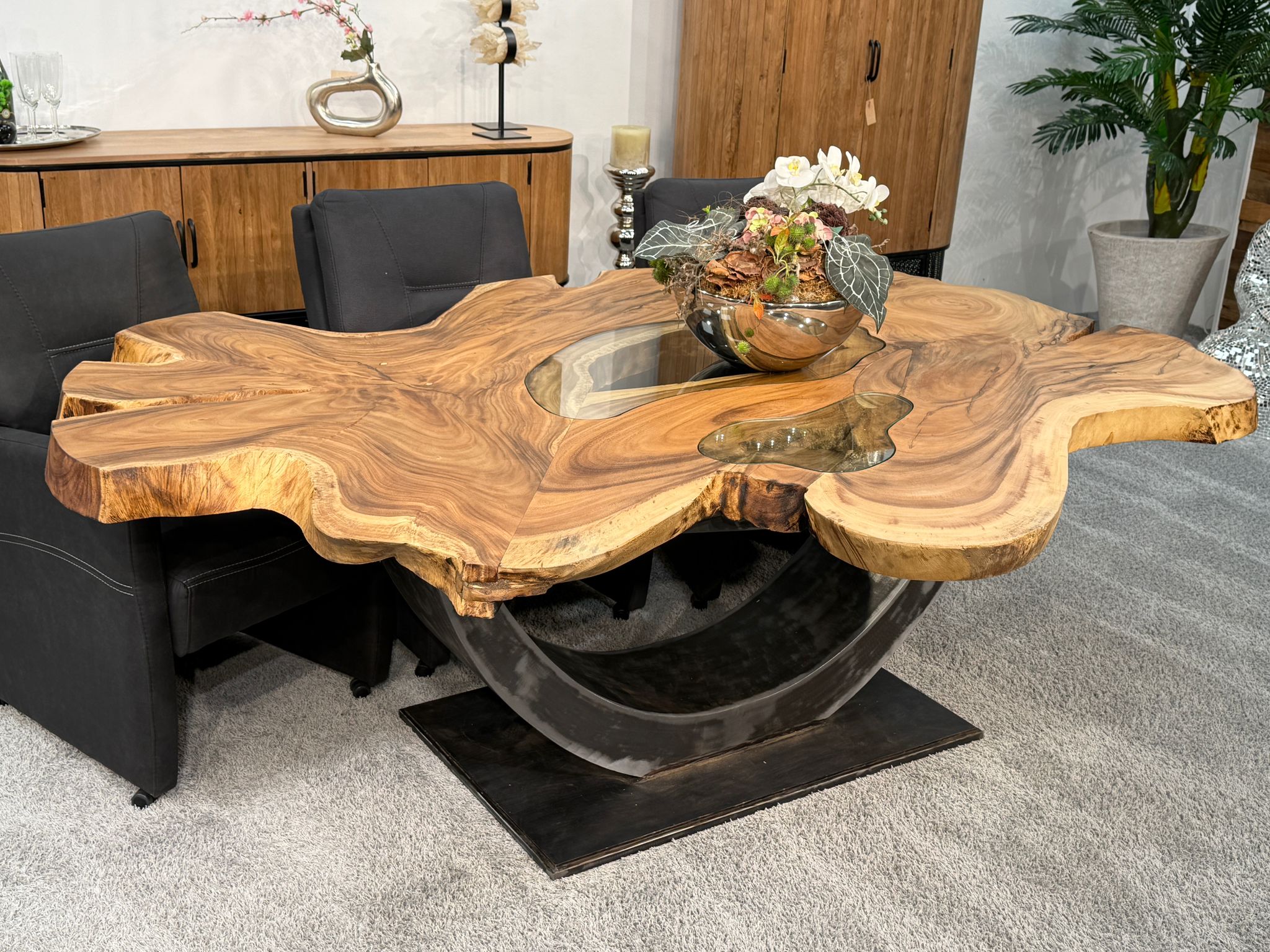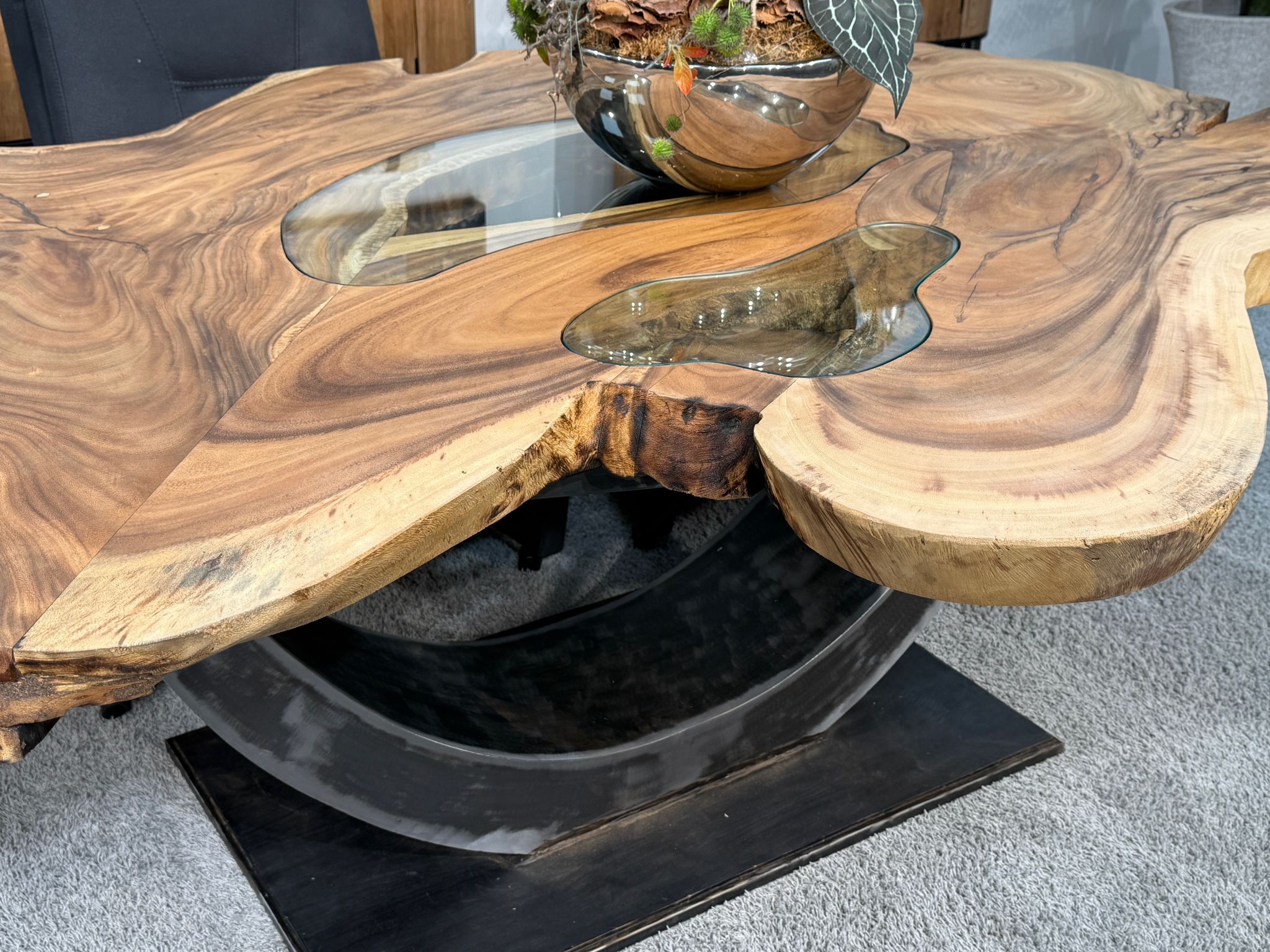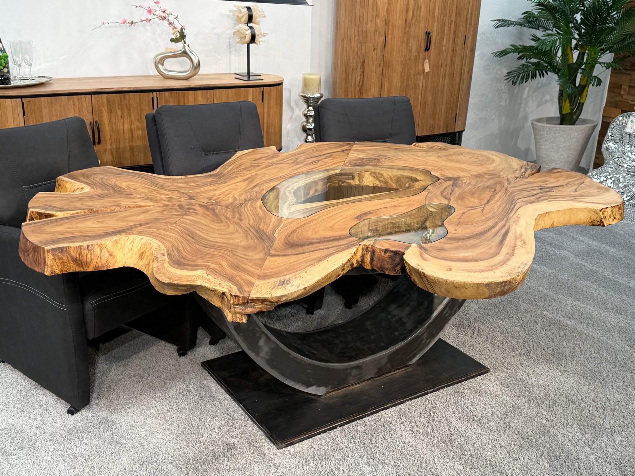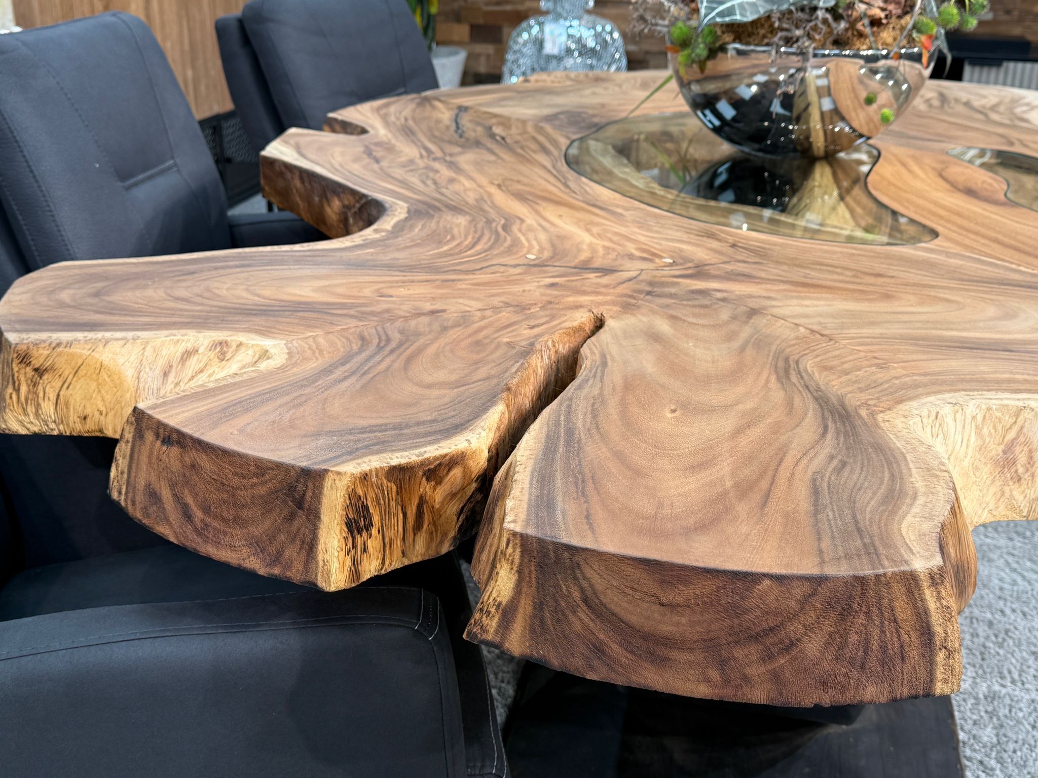 Material: Massive Baumscheiben (Suar), Tischgestell aus Rohstahl und Glaseinlagen