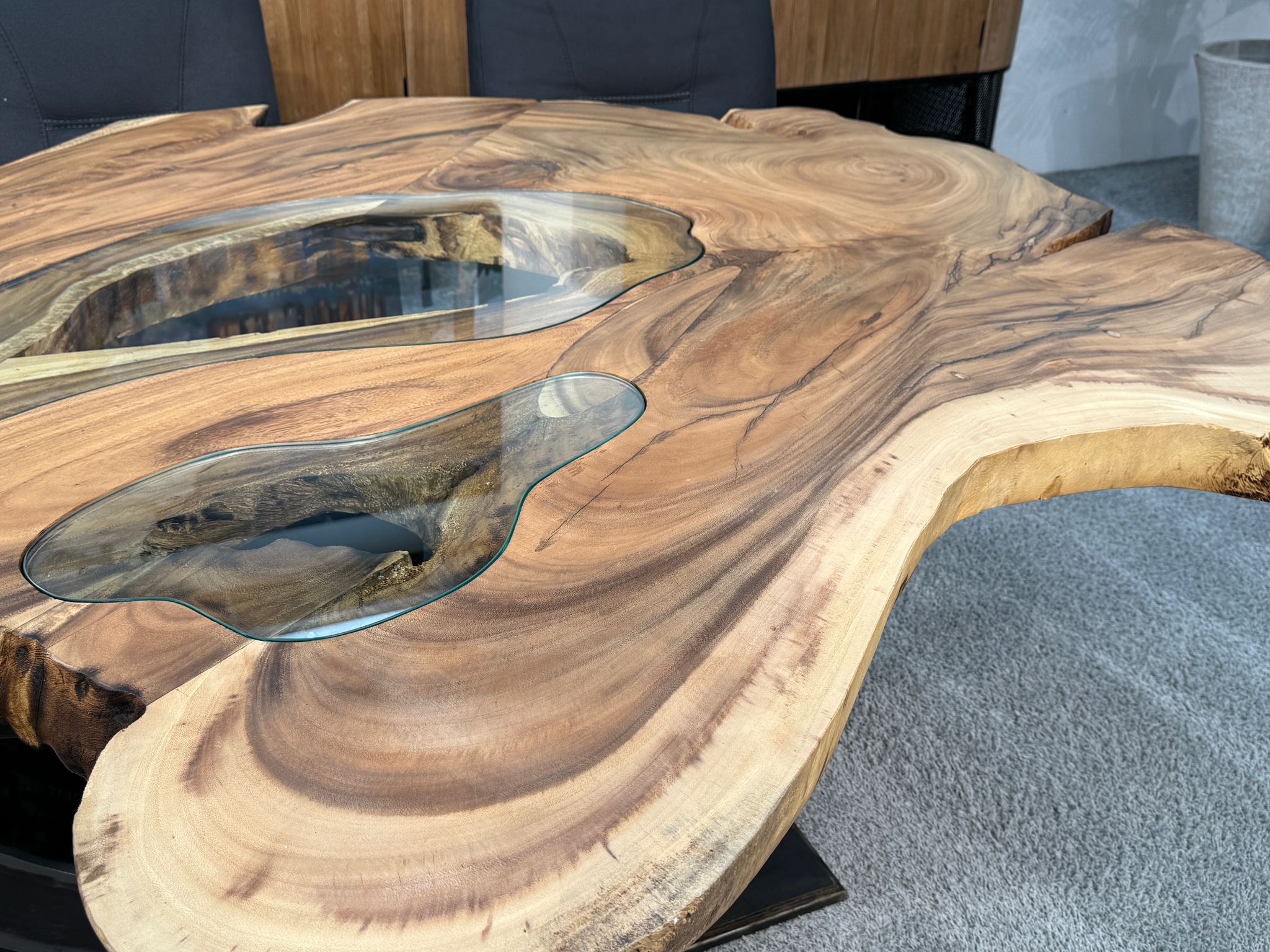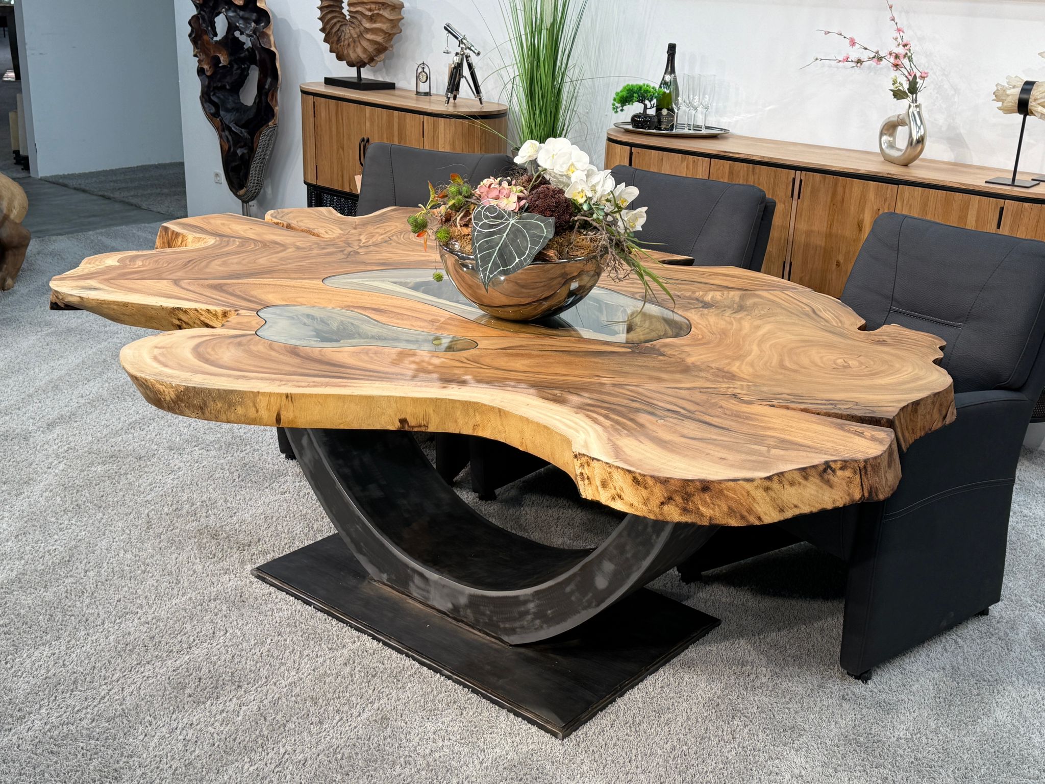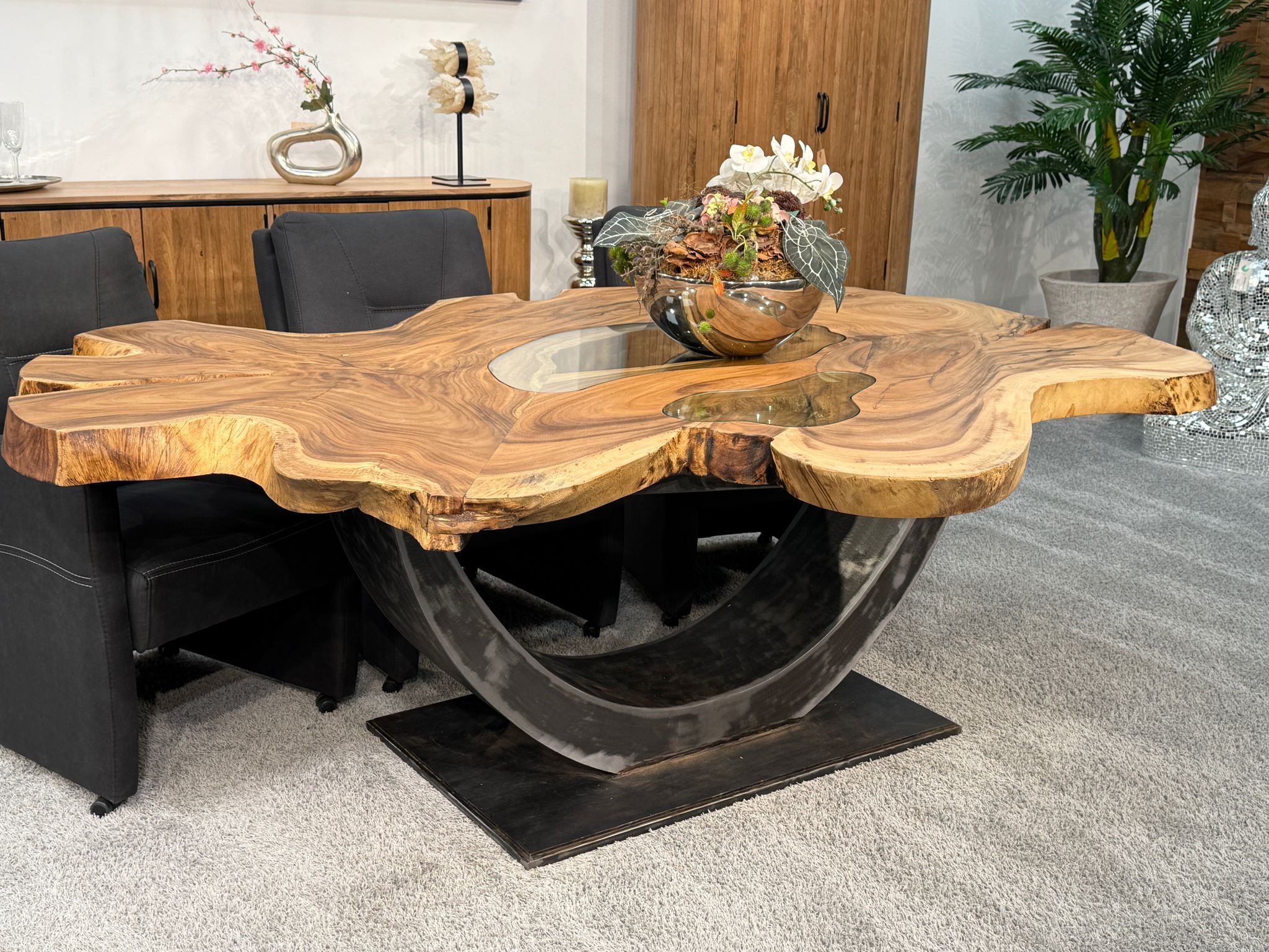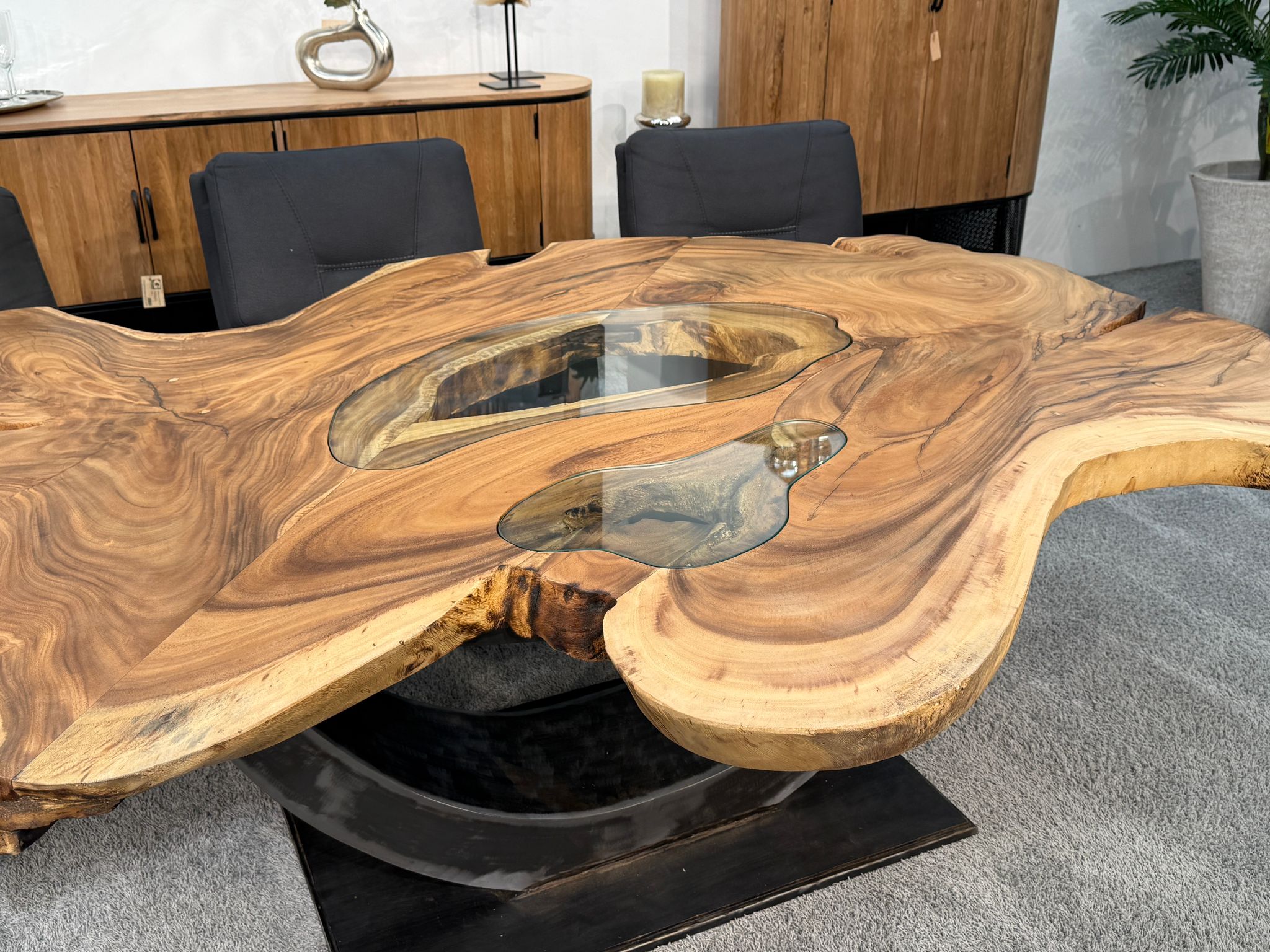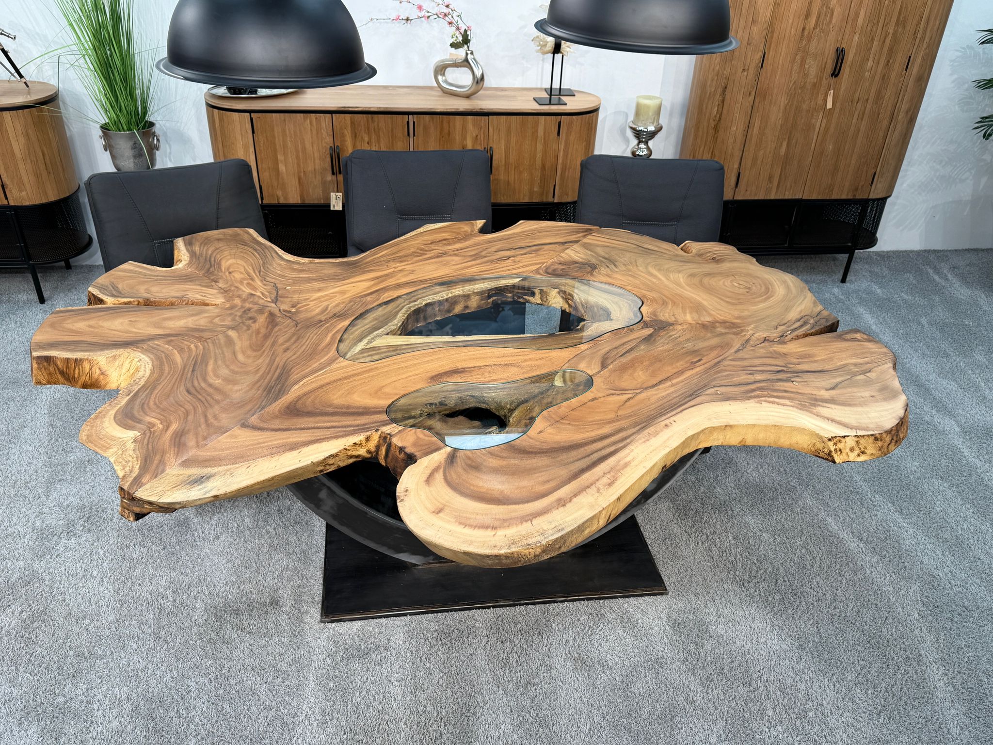 Material: Massive Baumscheiben (Suar), Tischgestell aus Rohstahl und Glaseinlagen