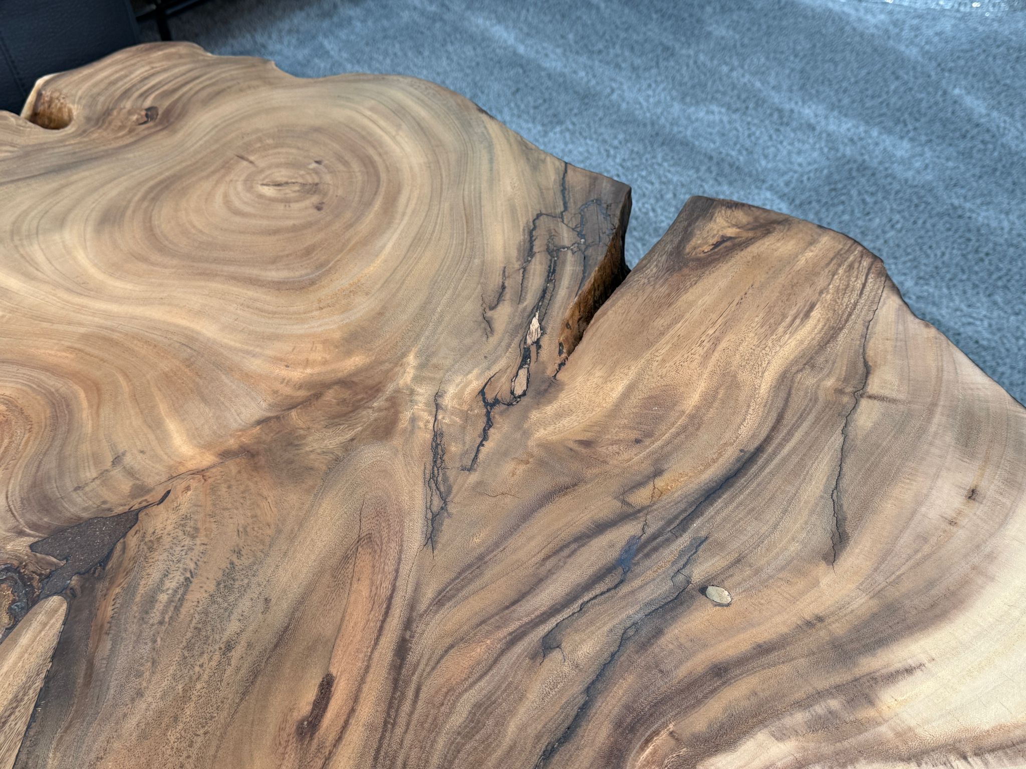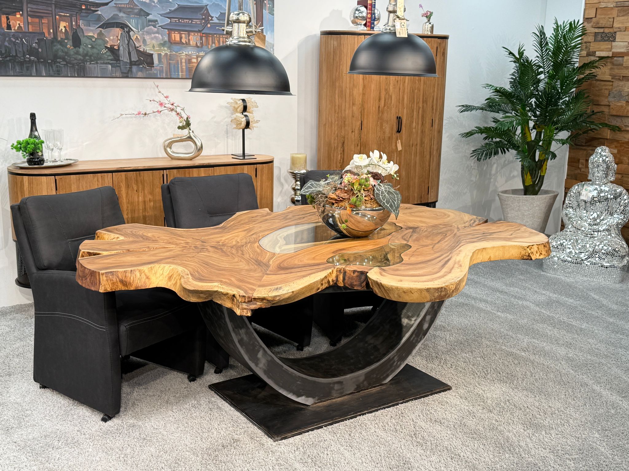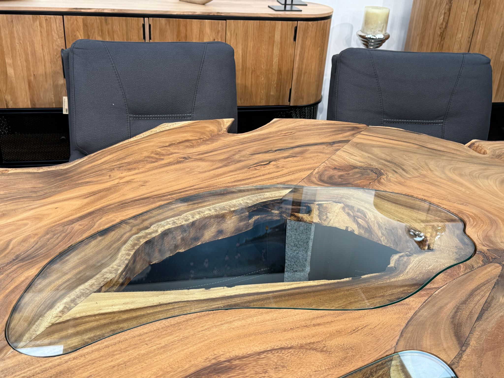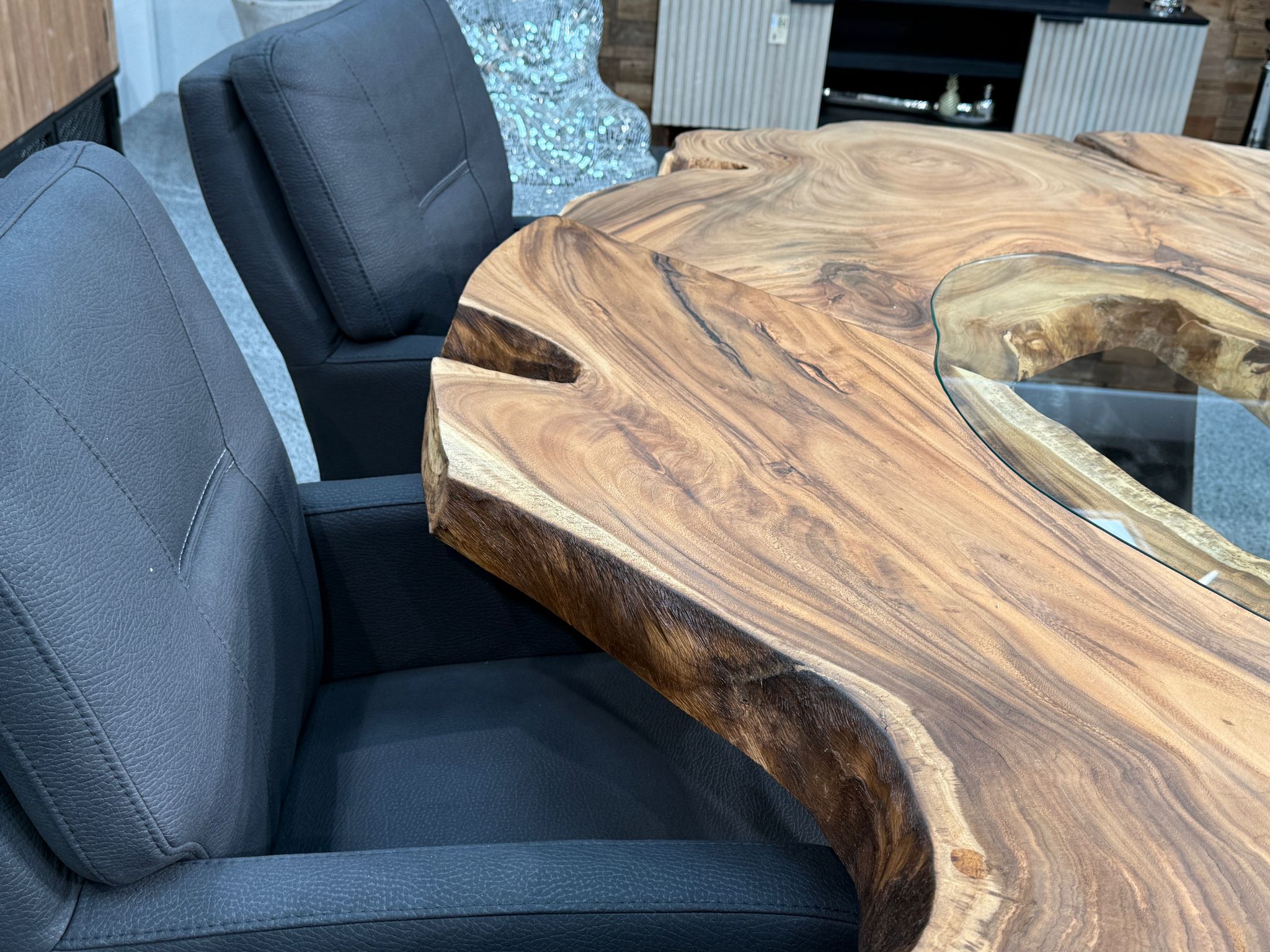 Material: Massive Baumscheiben (Suar), Tischgestell aus Rohstahl und Glaseinlagen