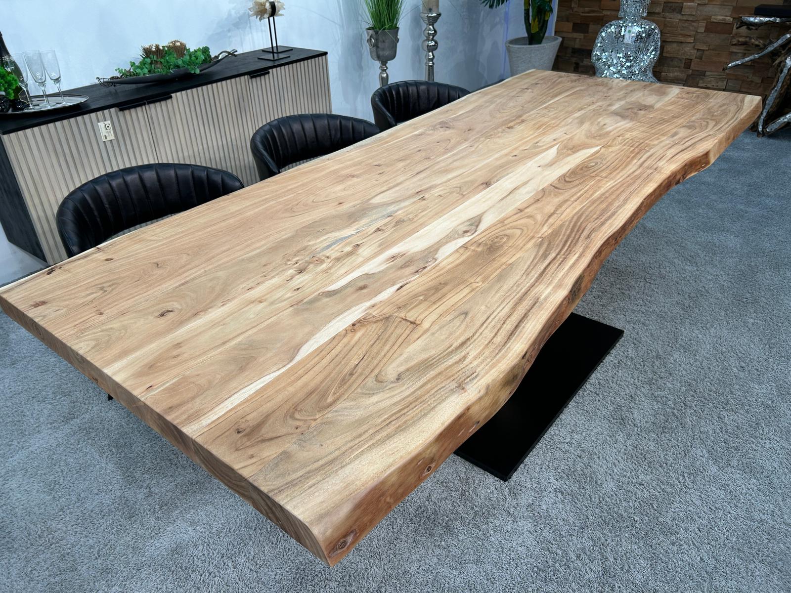 Der Esszimmertisch mit Baumkante kombiniert modernes Design mit der beeindruckenden Natürlichkeit von massivem Akazienholz. Die 55 mm starke Tischplatte mit seidenmatt lackierter Oberfläche bringt die warme und einzigartige Maserung des Holzes perfekt zur Geltung. Die natürlichen Baumkanten an den Längsseiten unterstreichen den rustikalen Charakter und machen jeden Tisch zu einem Unikat, das in jedem Esszimmer zum Highlight wird.