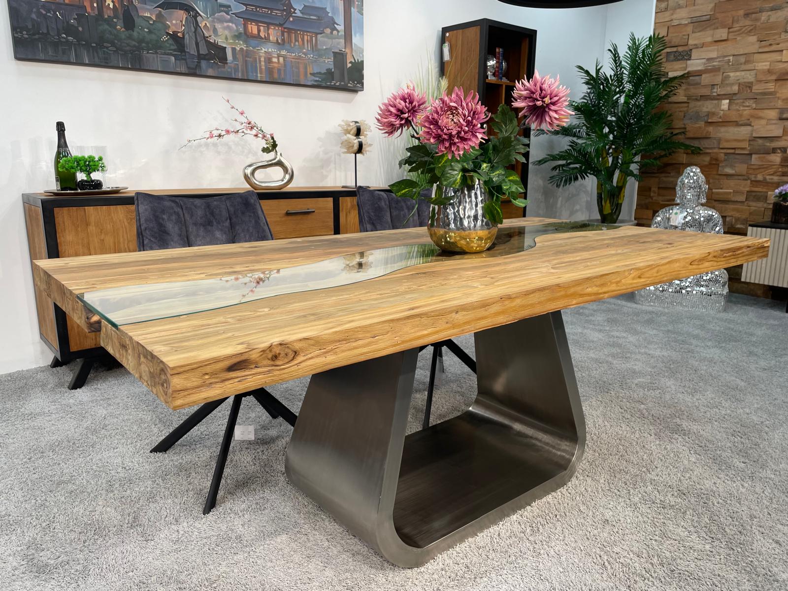 Materialien: Recyceltes Altholz (Teak), Tischgestell aus gebürstetem Edelstahl, Glaseinlage