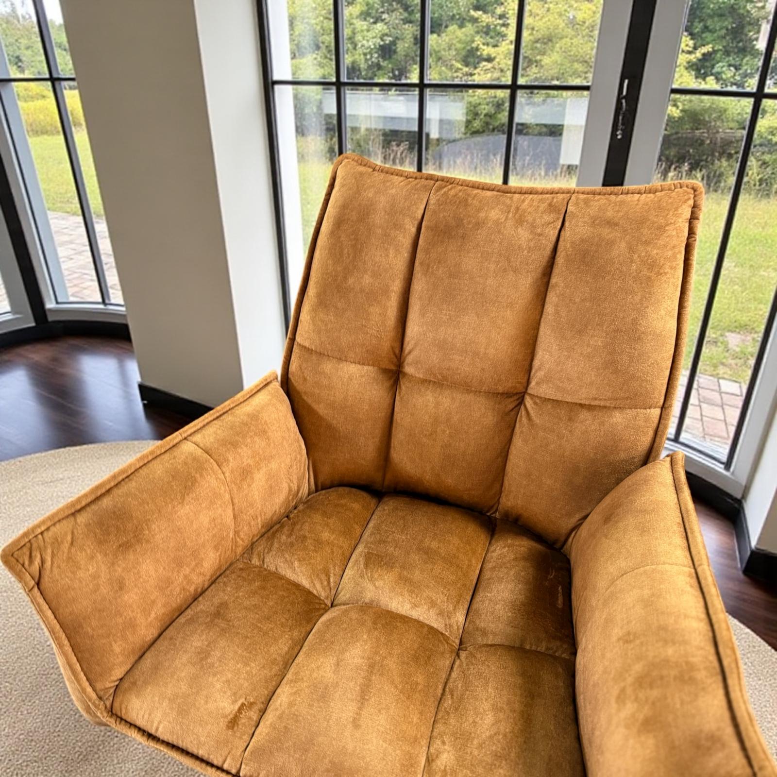 Die hochwertige Polsterung wurde mit einem Samtstoff in Farbe cognac bezogen. Das stabile Gestell aus Eisen ist schwarz (seidenmatt) lackiert. Die bequeme Sitzfläche ist um 360 Grad drehbar und stellt sich automatisch in seine Ursprungsposition zurück.