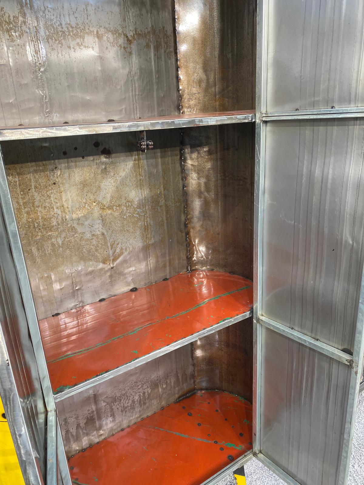 In reiner Handarbeit gearbeiteter Schrank aus recyceltem Metall mit zwei Türen.