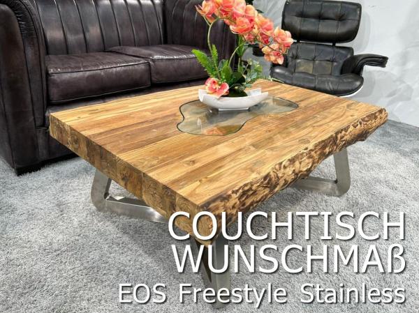 Wohnzimmertisch "Deep Island Freestyle" aus massivem recyceltem Teakholz mit Glas und Edelstahl