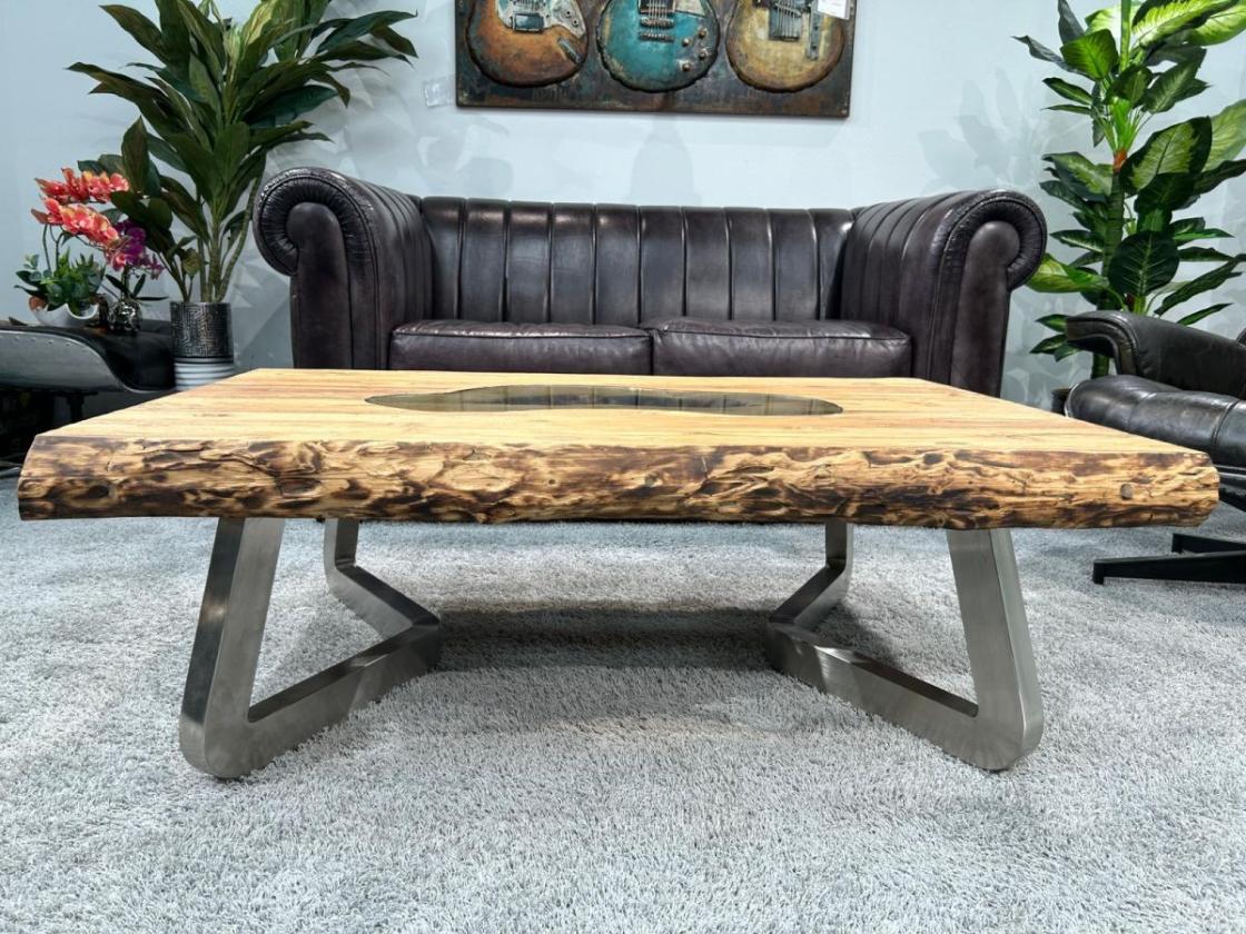 - Ein Highlight des Tisches ist der dekorative Glaseinleger, der in die Tischplatte eingearbeitet wurde. Das Design erinnert an einen kleinen See in einer Landschaft und verleiht dem Tisch eine zusätzliche optische Tiefe. Durch den Einsatz von Glas wird das Design des Couchtisches auf eine elegante und stilvolle Weise in Szene gesetzt.