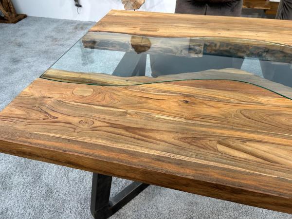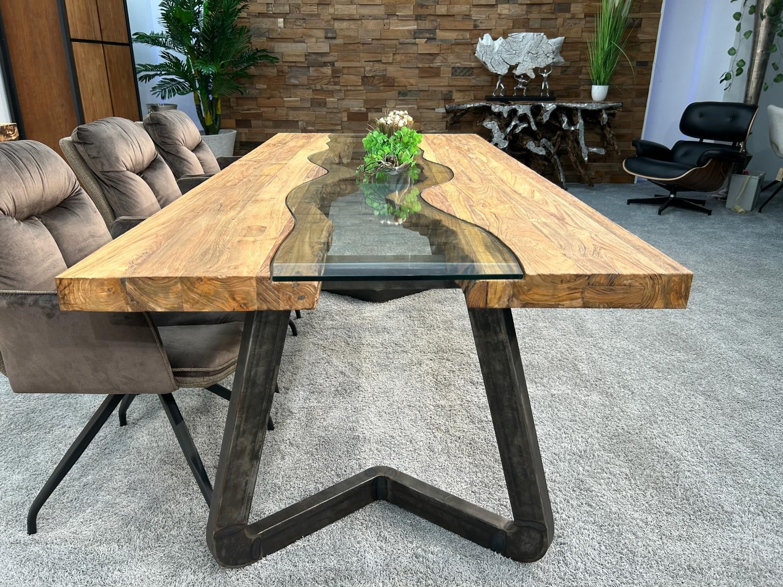 Recyceltes Teakholz, Tischgestell aus Rohstahl und einem mittig eingearbeitetem Glaseinleger