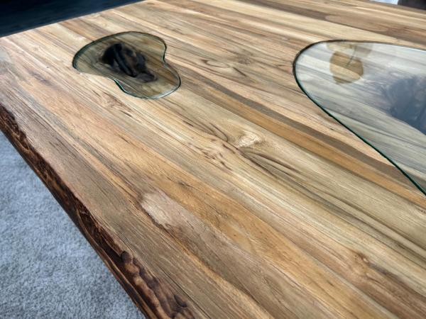 Recyceltes Teakholz, Tischgestell aus Rohstahl (Halbmond) und Glaseinleger