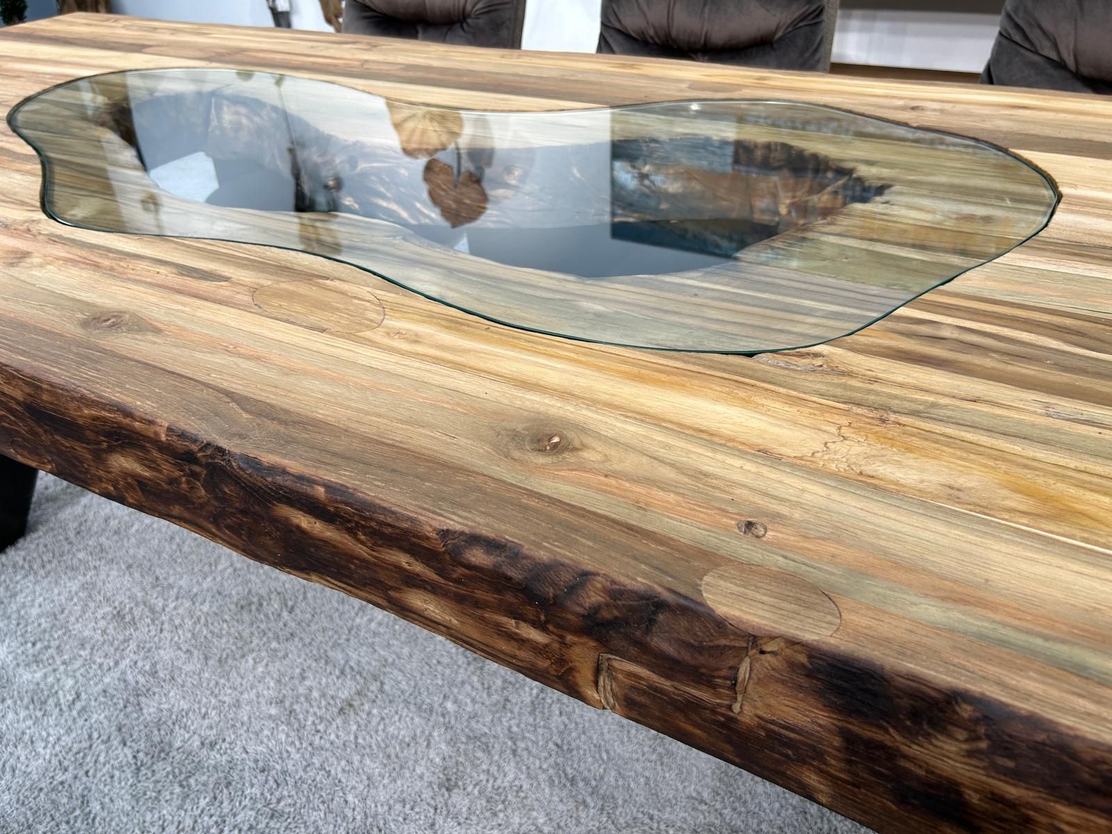 Bei diesem Esstisch aus Altholz bekommt der Begriff "Nachhaltigkeit" eine völlig neue Bedeutung. Die massive Tischplatte besteht aus verleimten Massivholzbohlen mit einer sagenhaften Stärke von 9 bis 10 cm. Die massiven Holzbohlen wurden aufwendig miteinander verleimt und von Hand gebürstet um die wunderschöne Struktur des Holzes hervorzuheben. Die Bearbeitungsspuren der früheren Nutzung der massiven Balken wurden in Kleinarbeit mit Holzdübeln und Holzeinlegern verziert. Ein zusätzliches Designelement der Serie "Deep Island" sind die Glaseinleger, die den Blick in das Innere der Tischplatte ermöglichen.