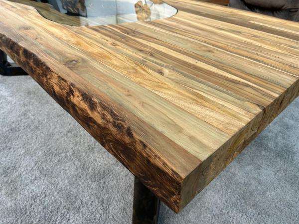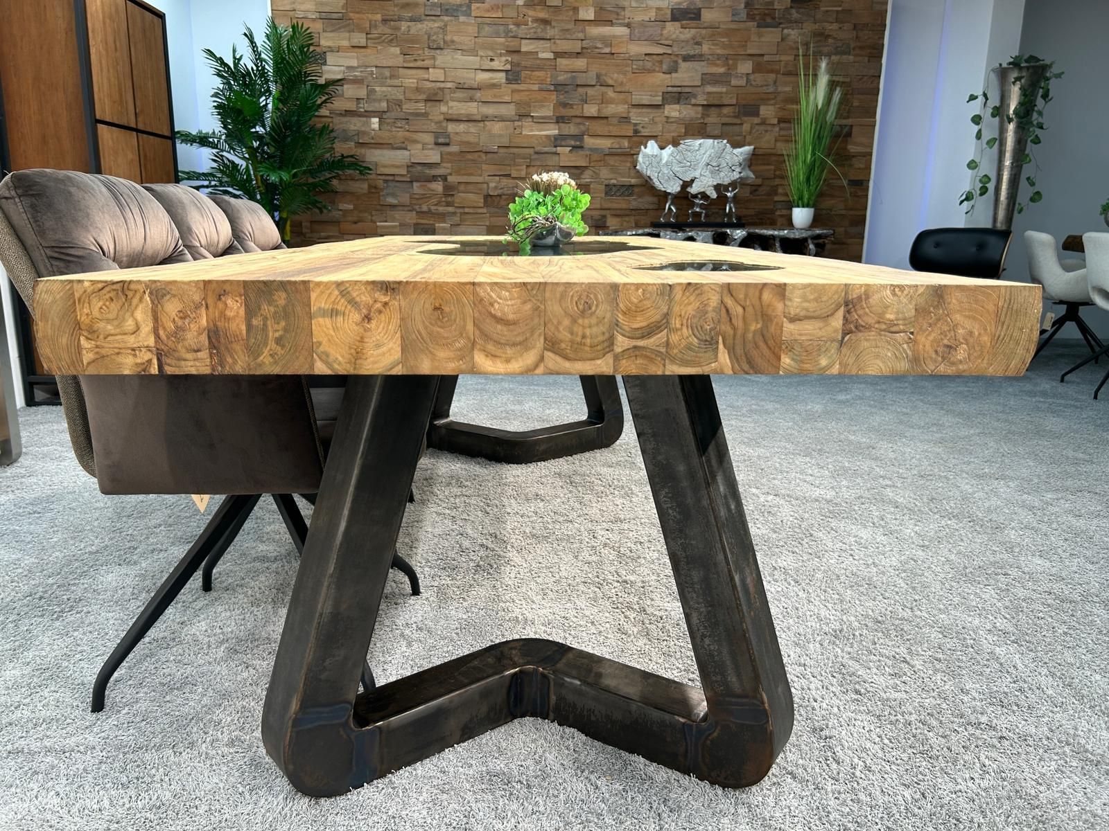 Recyceltes Teakholz, Tischgestell aus Rohstahl (Halbmond) und Glaseinleger