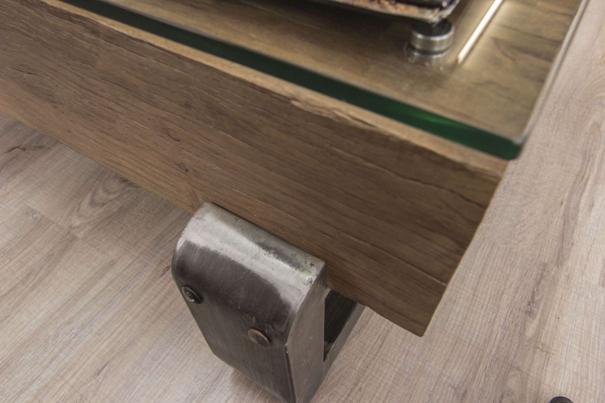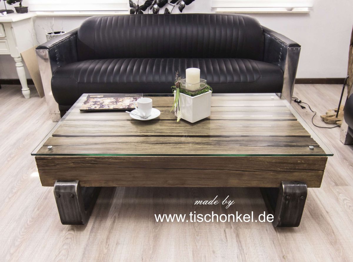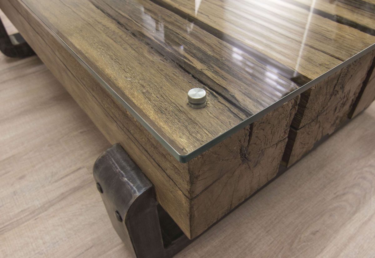 Eigenschaften: Außergewöhnlicher Couchtisch aus recyceltem Strommasten. Das Holz ist natürlich unbehandelt. Die Glasplatte im Format 120 x 70 cm hat eine Stärke von 10 mm.