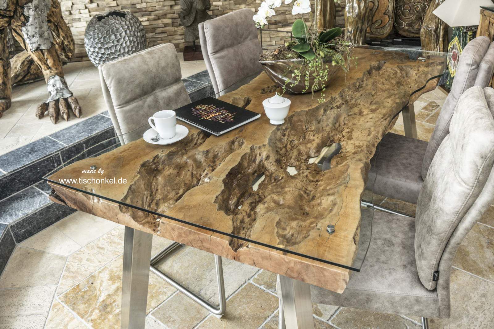 Ein außergewöhnlicher Esstisch kommt mit diesem Beitrag in unseren Onlineshop unter www.tischonkel.de. Außergewöhnliches Design für außergewöhnliche Menschen. Die Tischplatte für diesen Esstisch wurde aus einer massiven Baumscheibe des Litschi gefertigt. Die Struktur des Litschi ist der des Wurzelholz sehr ähnlich. Alle Formen und Strukturen dieser Tischplatte für einen außergewöhnlichen Esstisch wurden so belassen wie die Natur sie geschaffen hat. Durch die in Form geschnittene Glasplatte hat man einen einzigartigen Einblick in das Design der Natur.