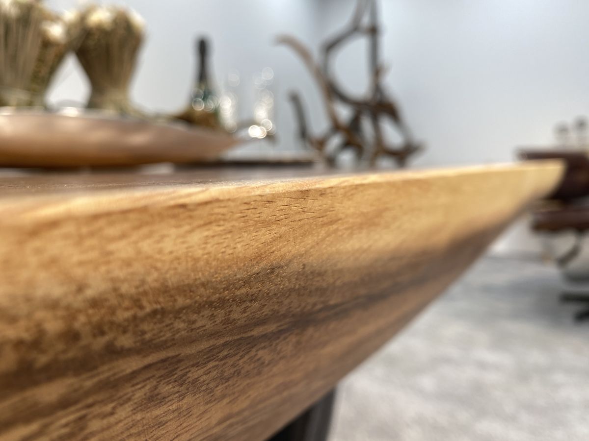 Der traumhafte Esstisch „Meridian“ aus aufwendig verleimten Baumscheiben mit einer Stärke von ca. 8 cm, mit seitlicher Wildkante. Die Oberflächen der Tischplatte wurde fein geschliffen und mit einem hochwertigen seidenmatten Möbellack versehen. Selbstverständlich stammt das verwendete Holz aus zertifiziertem Anbau. Durch die Verwendung von Kernholz erhält die Tischplatte einen einzigartigen Charakter mit einer wunderbar betonten Holzstruktur, die aufgrund der aufwendigen Verleimung, anders als eine voll stämmige Platte, weniger zu Verwindungen neigt.