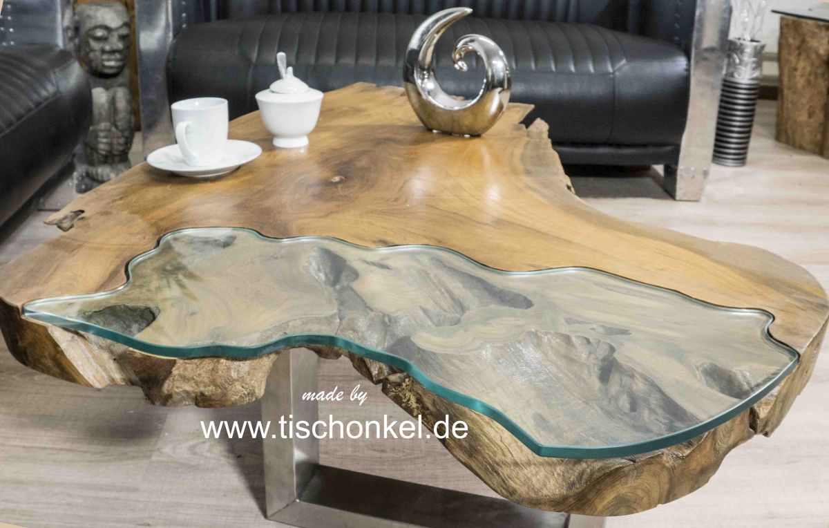 Couchtisch aus einem Baumstumpf (Baumscheibe) Teak mit Glaseinleger und Tischgestell aus Edelstahl