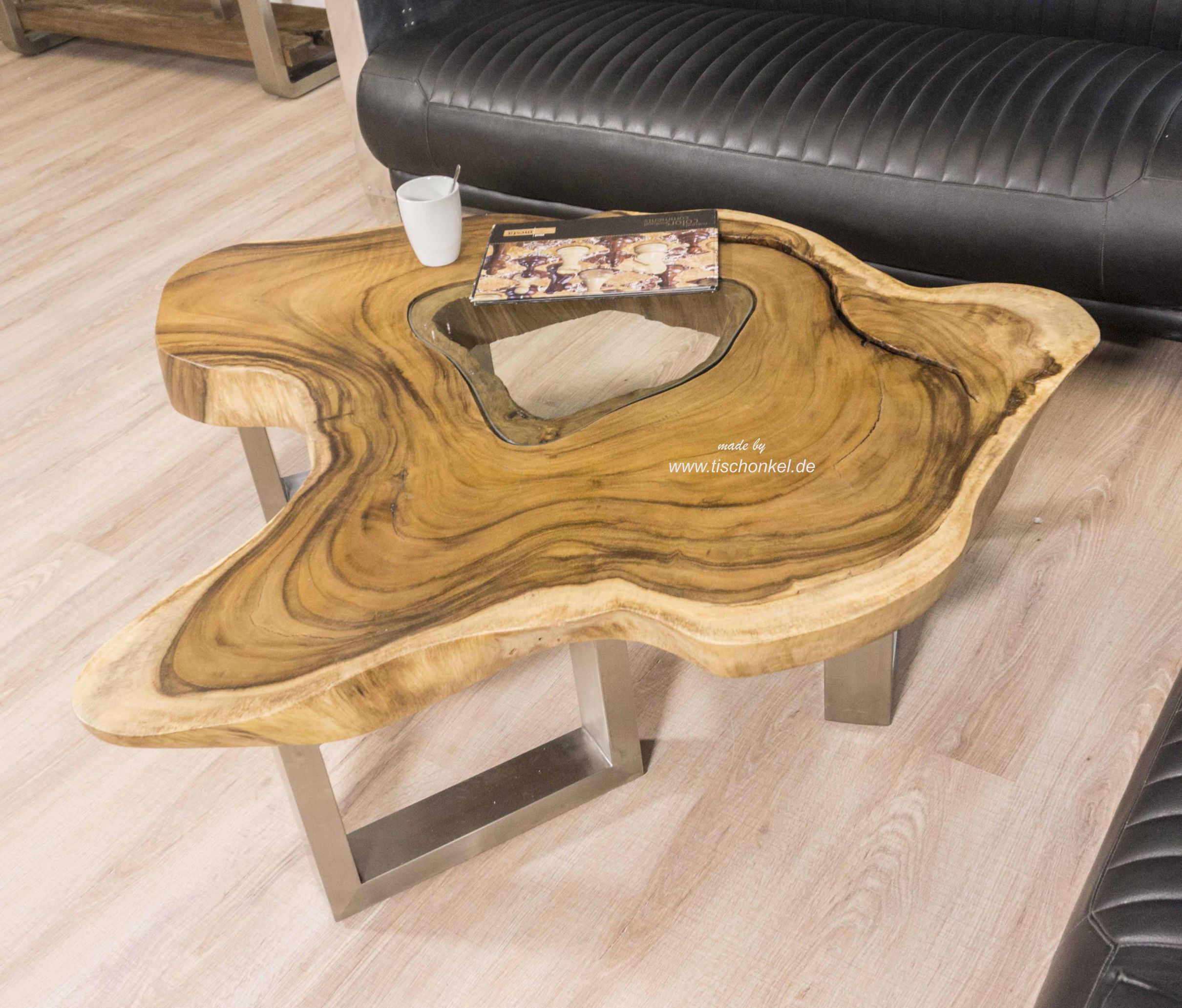 Couchtisch aus einer Baumscheibe mit einer runden Glaseinlage