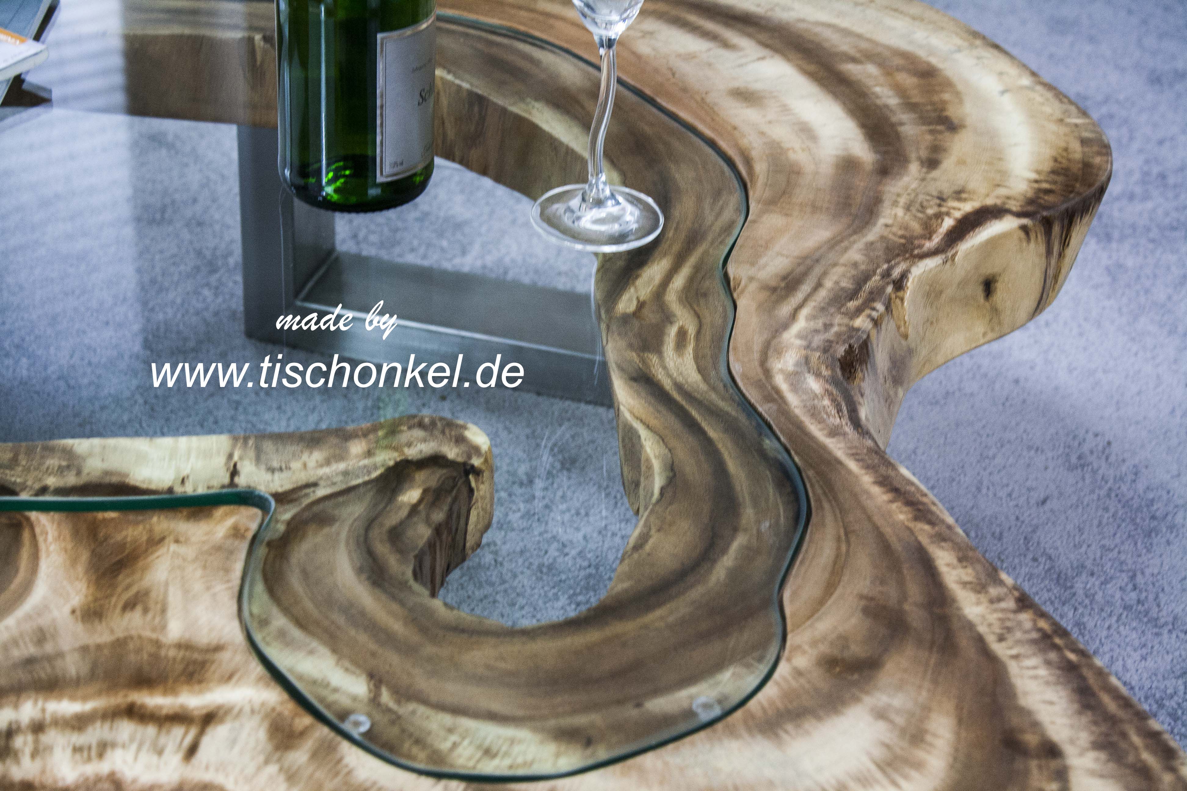 Couchtisch aus einer Baumscheibe, ein Traum aus Massivholz, Edelstahl und Glas