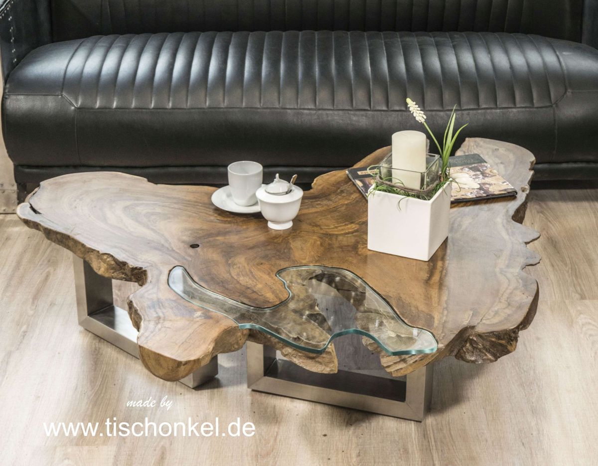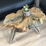 Couchtisch aus einer Baumscheibe (Teakholz) mit kunstvollen Einlagen aus Glas