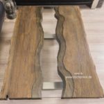 Die beiden außen liegenden Massivholzbohlen bestehen aus recyceltem Teakholz. Zwischen den beiden Bohlen aus Holz befindet sich ein Zwischenraum mit einer natürlichen Wildkarte, welche wir mit einem kunstvoll geschnittenem Formglas mit einer stabilen Stärke von 10 mm verziert haben. Das Tischgestell für den Couchtisch aus Holz wurde in Handarbeit aus gebürstetem Edelstahl gefertigt.