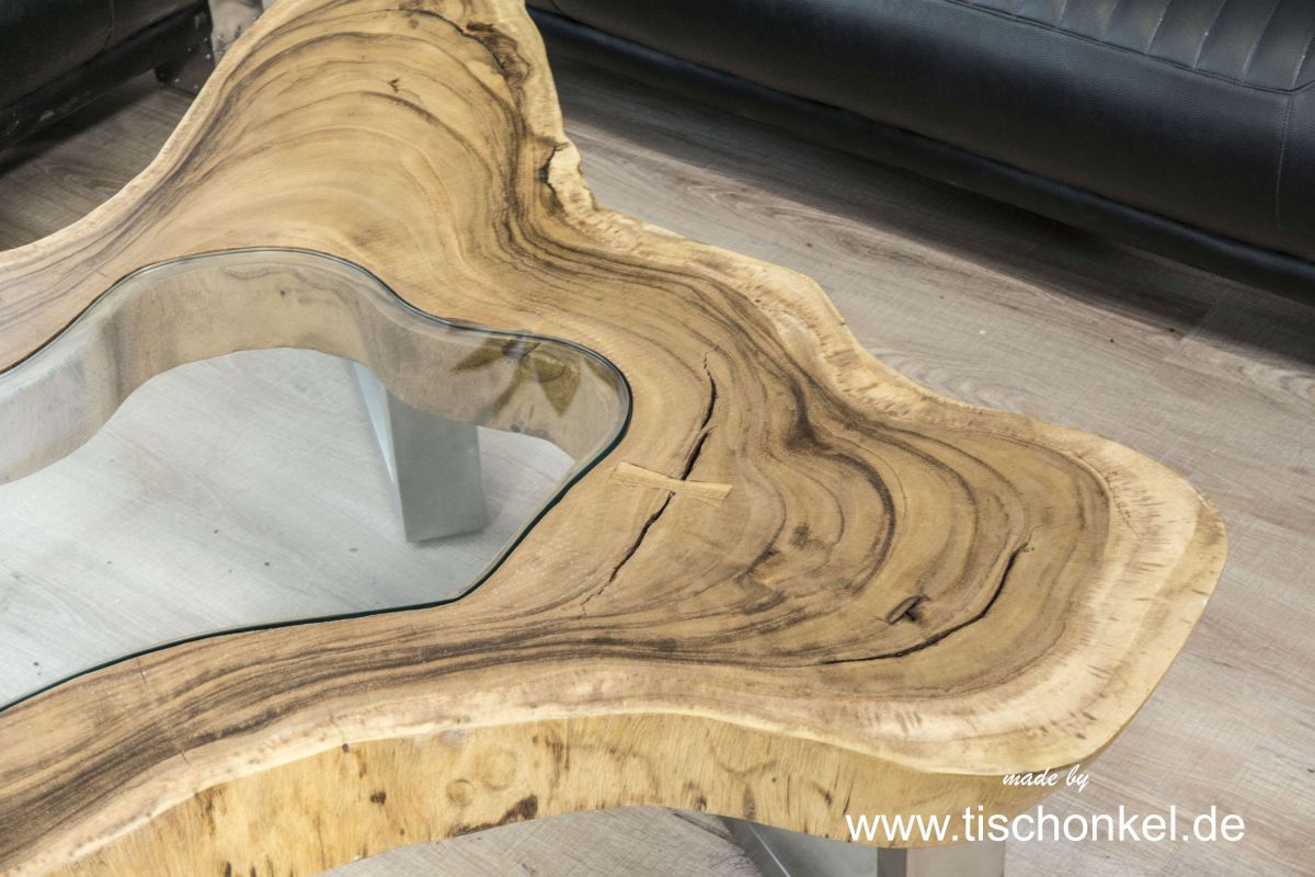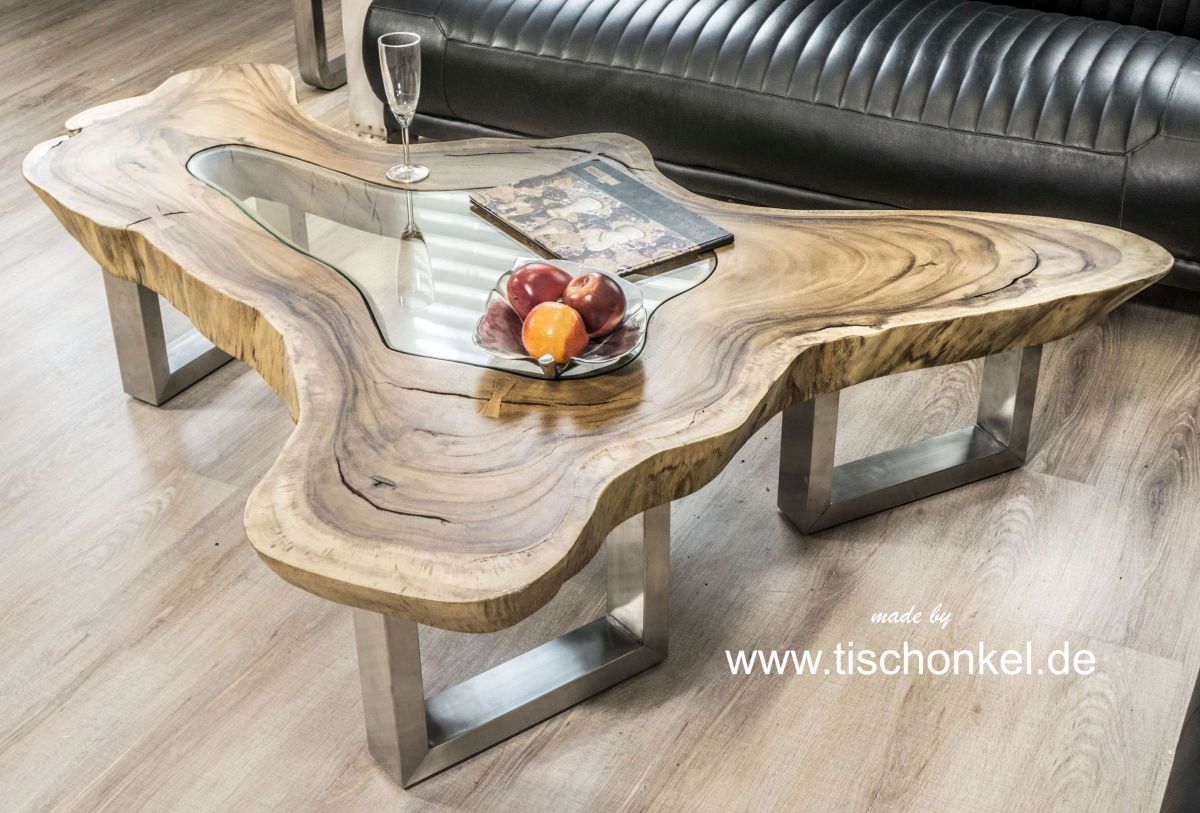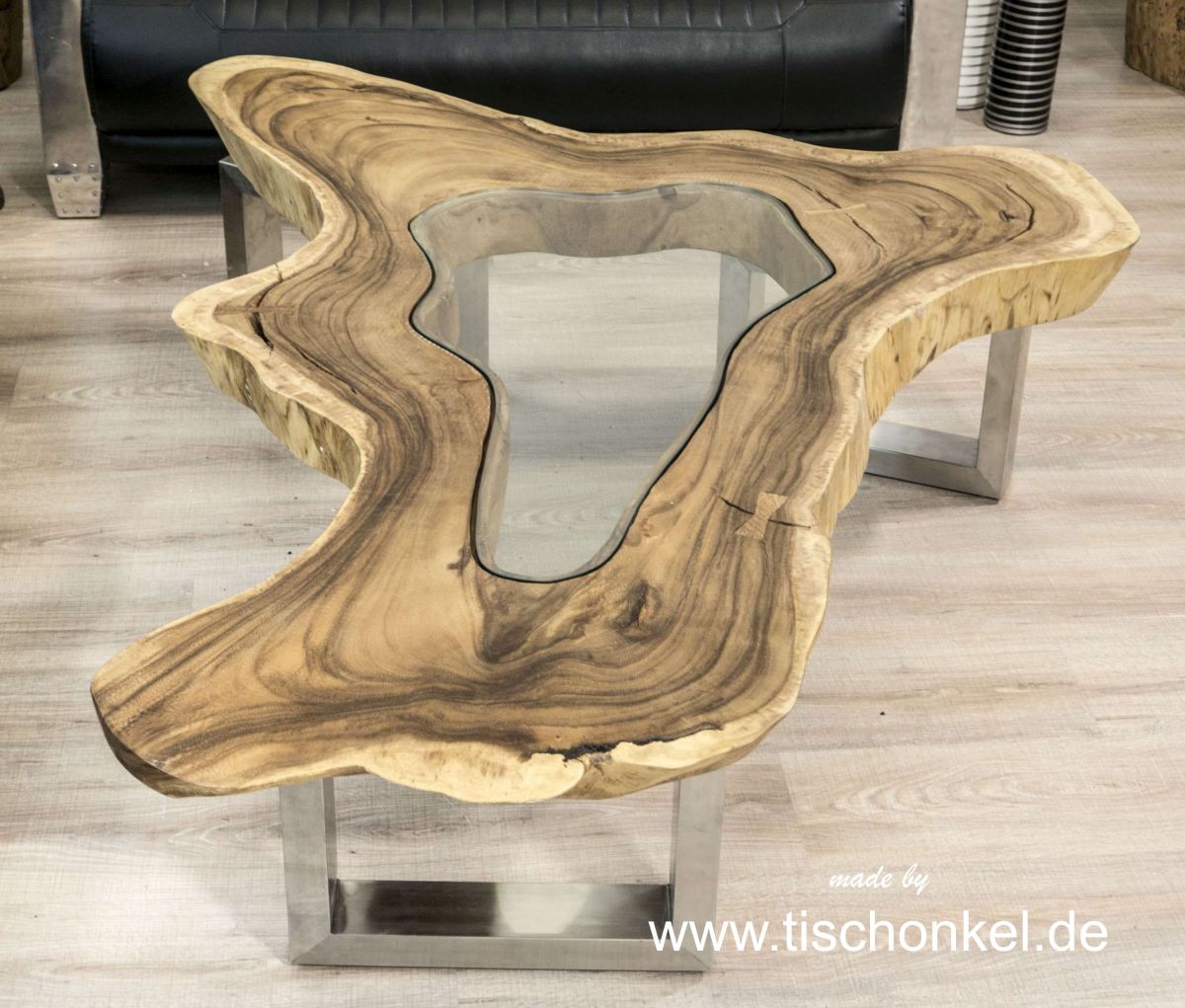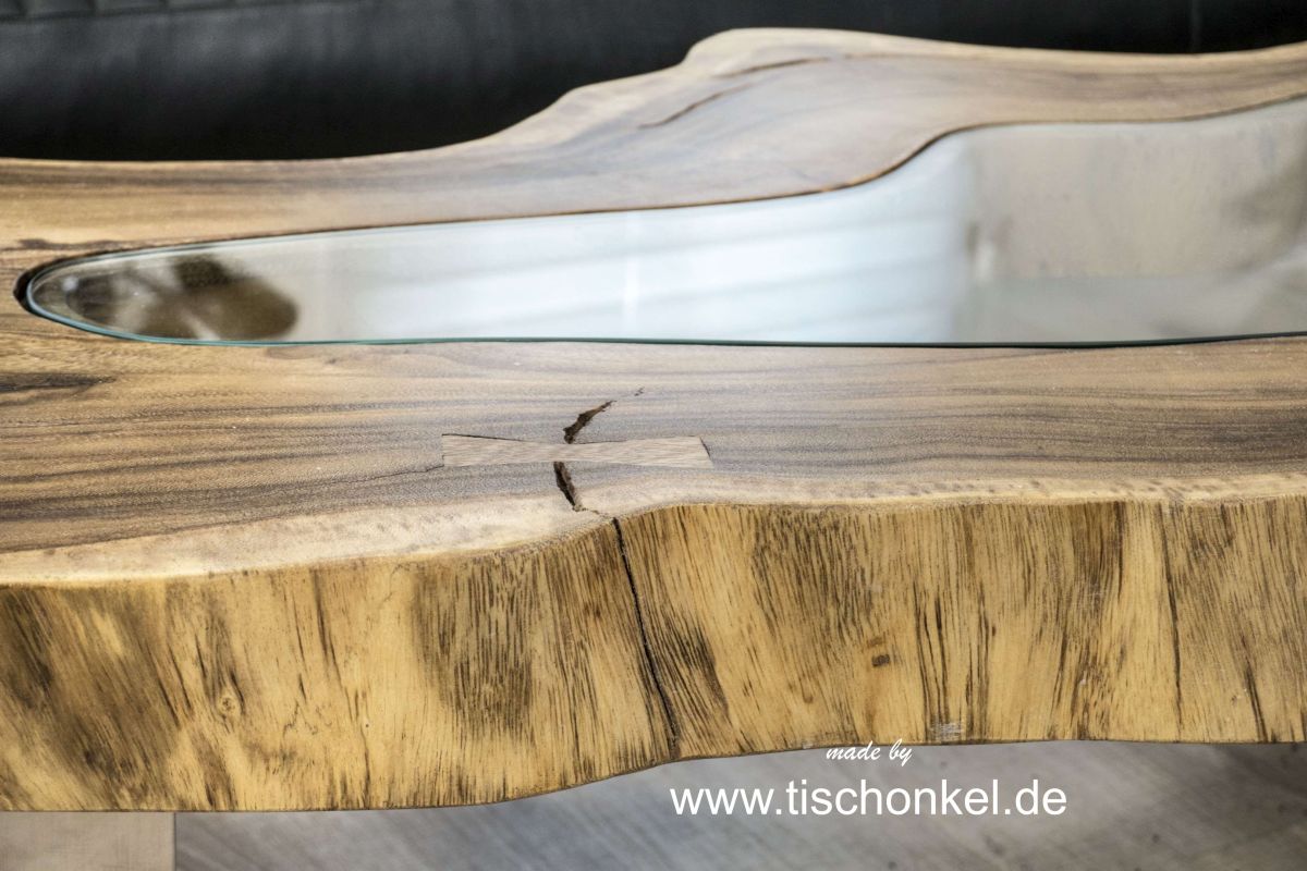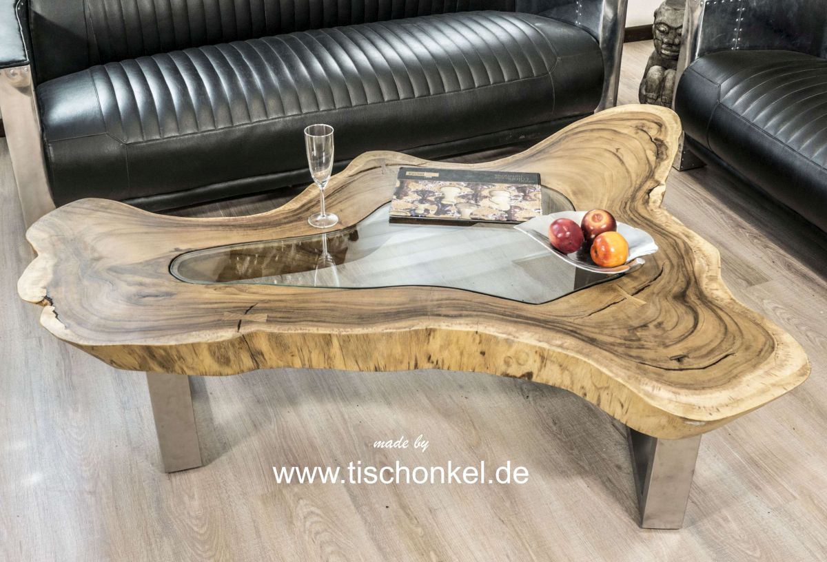 Eigenschaften: Couchtisch Clash aus einem massiven Baumstamm. In der Mitte der Baumscheibe wurde in reiner Handarbeit ein Glaseinleger eingearbeitet. Die Höhe des Couchtisches ist variabel, da wir Ihnen unterschiedliche Tischgestelle für diesen Couchtisch anbieten können.