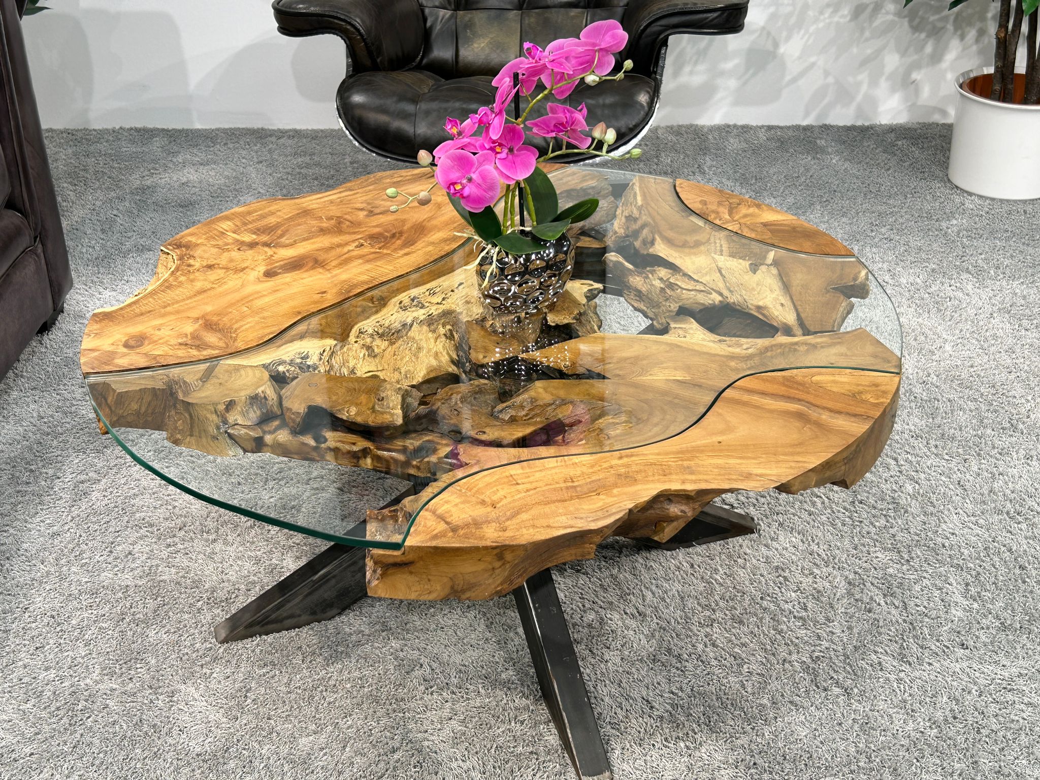 Massenproduktion ist nichts für uns. Wie schade wäre es auch, wenn man jeden für sich einzigartigen Baum in immergleiche Möbel verwandeln würde. Unsere Tischler nehmen jedes Stück Holz in die Hand, überlegen, ob der Couchtisch rund, eckig oder oval werden soll und verarbeiten es möglichst so, wie die Natur es mit ihren Formen vorgibt. Den inneren Rand beider Holzstücke, der ehemals die Baumkante bildete, ließen wir so, wie er war. An diese Ränder arbeiteten wir dafür eine Glaseinlage an, die den Tisch auf ganzer Fläche nutzbar macht, den tollen Blick auf die Konturen aber nicht versperrt. Ein eigens angefertigtes Design-Edelstahlgestell bietet dem Tisch nicht nur sicheren Halt, sondern ist wie der Rest ein Hingucker für sich.