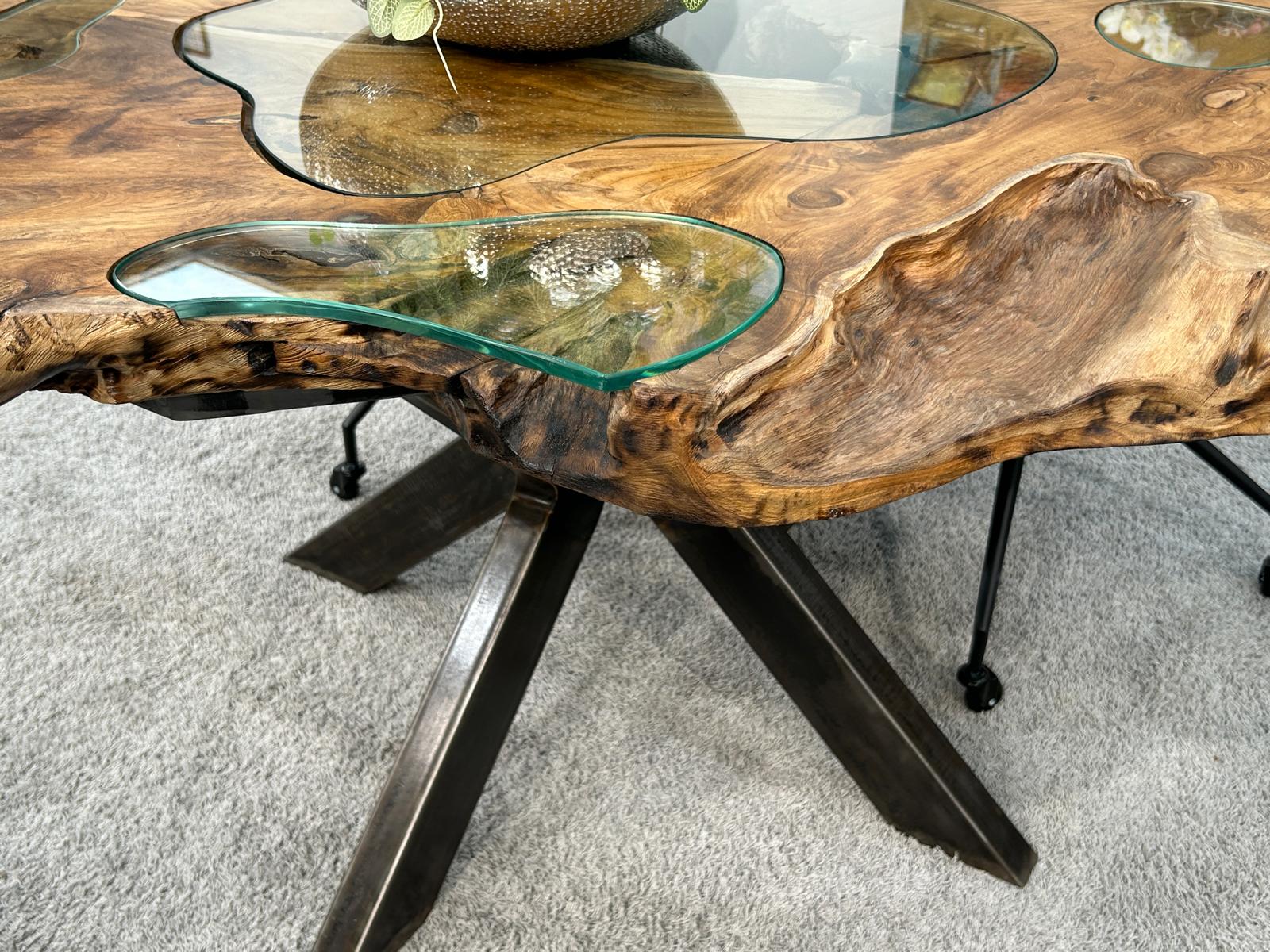 Bei dem Esstisch „Eternia Root“ handelt es sich um eine interessante Kombination aus den Rohstoffen Teak, Rohstahl und Glas. Durch die Verwendung von Baumscheiben aus dem Bereich der Baumwurzel erhält dieser Esstisch seine ganz besondere Optik. Dabei schneiden unsere Partnerhandwerker in Indonesien wunderschöne Baumscheiben aus dem Wurzelbereich bereits gefällter Bäume. Die von Hand zusammengefügte massive Tischplatte liegt auf einem Tischgestell aus Rohstahl in Kreuzform und bietet ausreichend Platz für 5–6 Personen. Die eingefrästen Glaseinlagen haben eine Stärke von 10 mm. Ein Esstisch der Modellserie „Eternia Root“ ist ein Hingucker für jedes Zuhause.