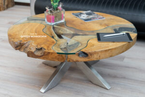 Material: Teakholz Baumscheibe (Baumwurzel), mit Tischgestell in Kreuzform aus Edelstahl und diversen Glaseinlagen