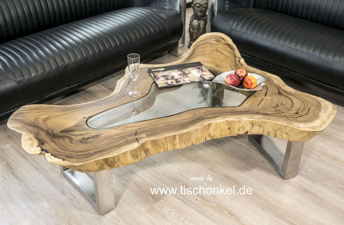 Couchtisch „Clash“ aus einer Baumscheibe mit Glaseinlage