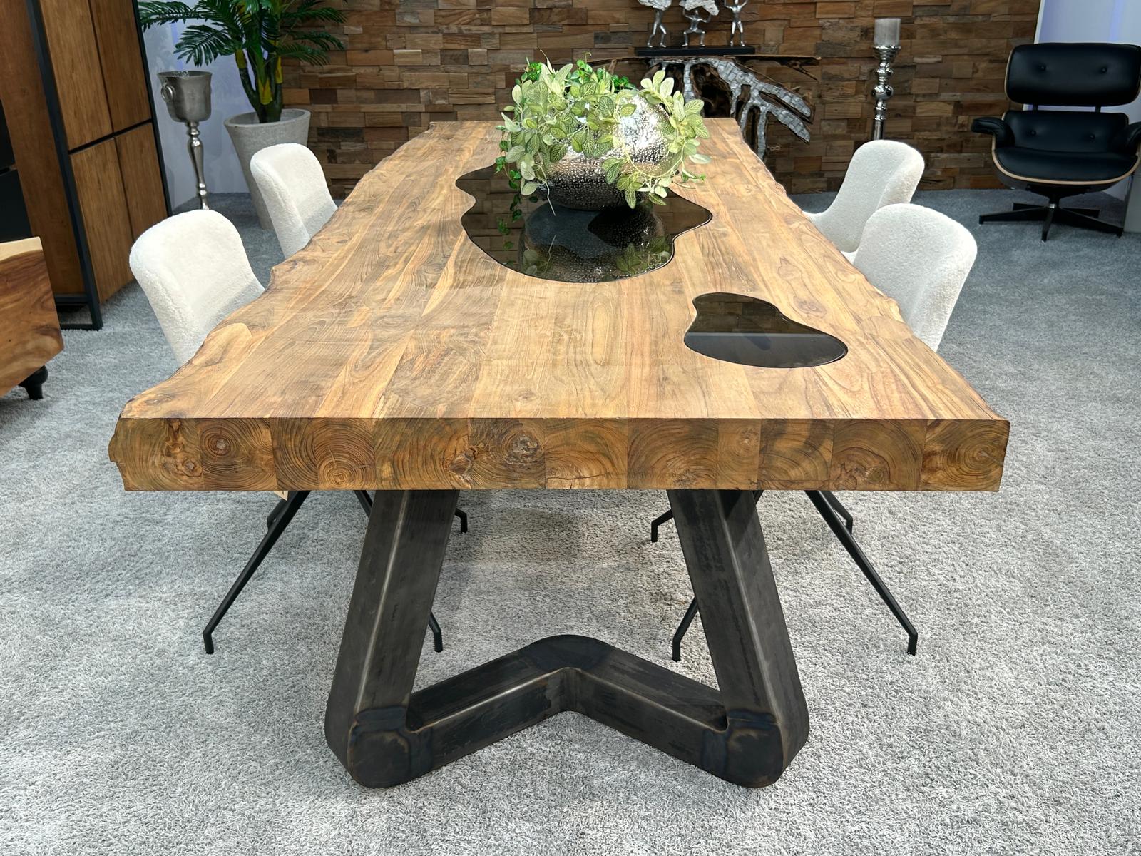 Modell: Massivholztisch aus recyceltem Teakholz „Fusion“, mit einem Tischgestell im Industriedesign Format: ca. 350 x 118-142 x 77 cm, Stärke der Platte 10 cm Materialien: Massivholz (recyceltes Teakholz), Tischgestell aus Rohstahl in Form eines Halbmondes, Glas
