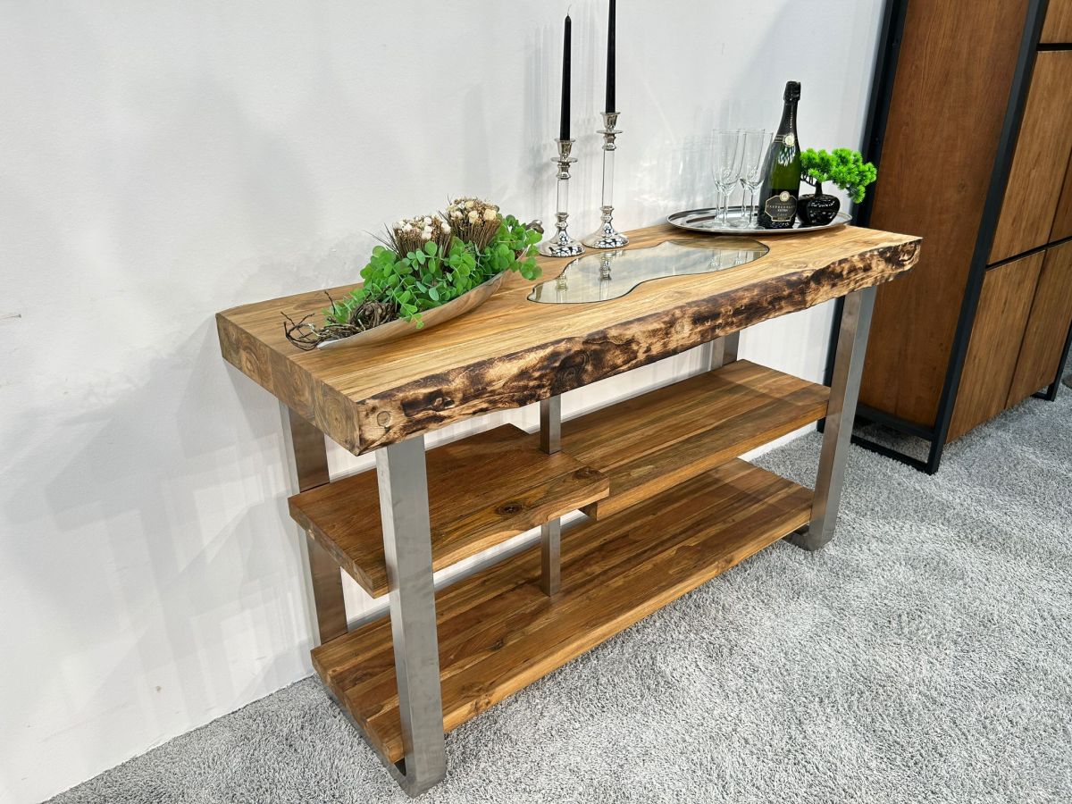 Unser Sideboard aus massivem Suar-Baumstamm mit Glasplatte ist eine einzigartige Kombination aus handwerklicher Kunstfertigkeit und funktionaler Ästhetik. Jedes Möbelstück wird von Hand gefertigt, um sicherzustellen, dass jedes Stück ein Unikat ist und seine eigene individuelle Schönheit und Charakter aufweist. Der Baumstamm des Suarholzes, aus dem das Sideboard hergestellt wird, ist bekannt für seine Robustheit und Langlebigkeit, was das Sideboard zu einem Möbelstück macht, das für die Ewigkeit gebaut ist.