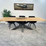 Der heute in diesem Blogbeitrag vorgestellt Esstisch aus Eiche besteht aus 4 cm massiven Eichenbohlen, stabil verleimt, fein geschliffen und wurde transparent mit einem neutralen Hartwachs-Öl der Marke OSMO versiegelt. Das Tischgestell in Kreuzform besteht aus Rohstahl im Industriedesign und wurde, wie die Tischplatte für diesen Esstisch aus Eiche auch, in reiner Handarbeit hergestellt.