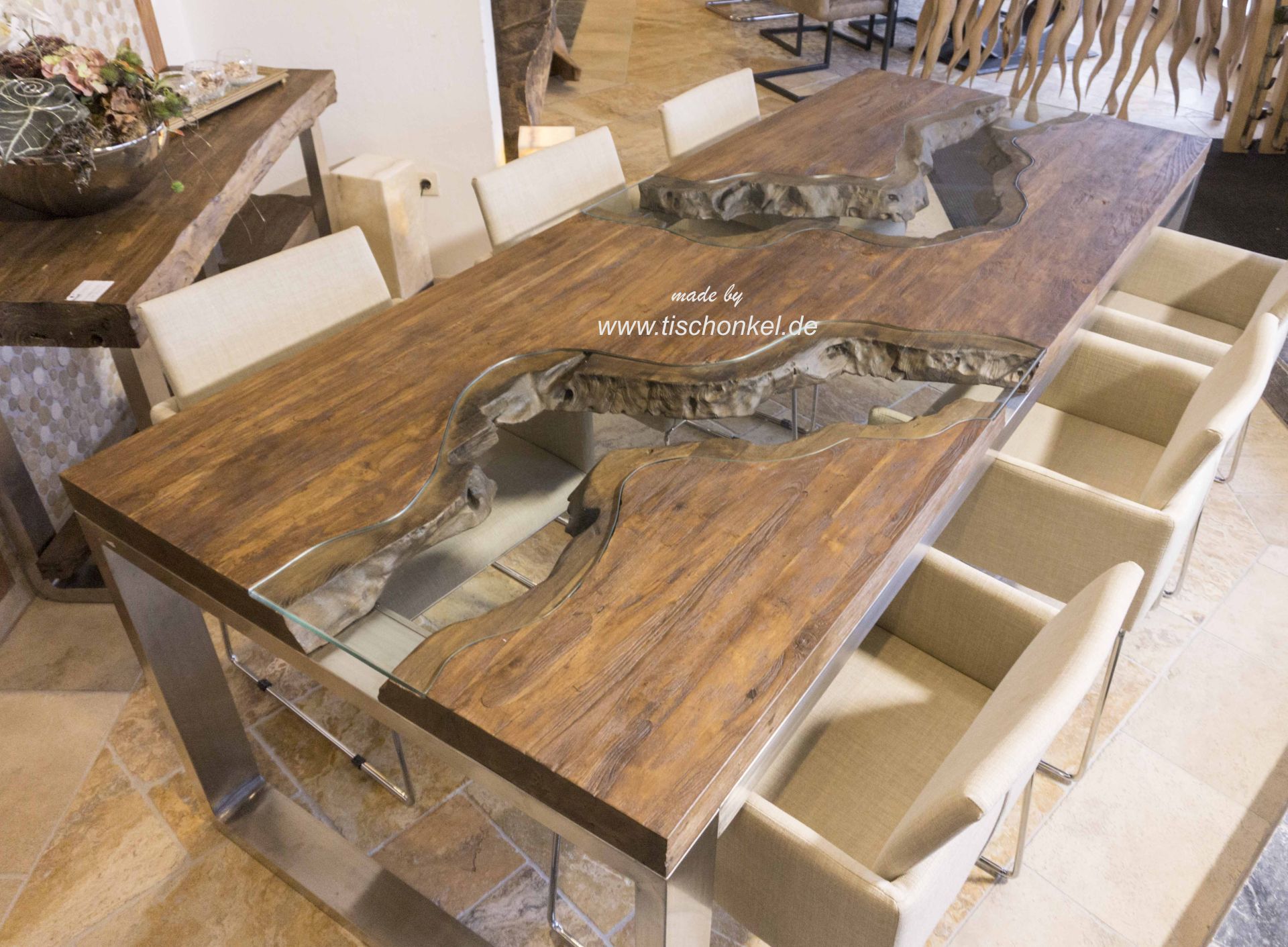Esstisch „Landscape“ von GERKEN Wohndesign, Design aus Altholz, Edelstahl und Glas