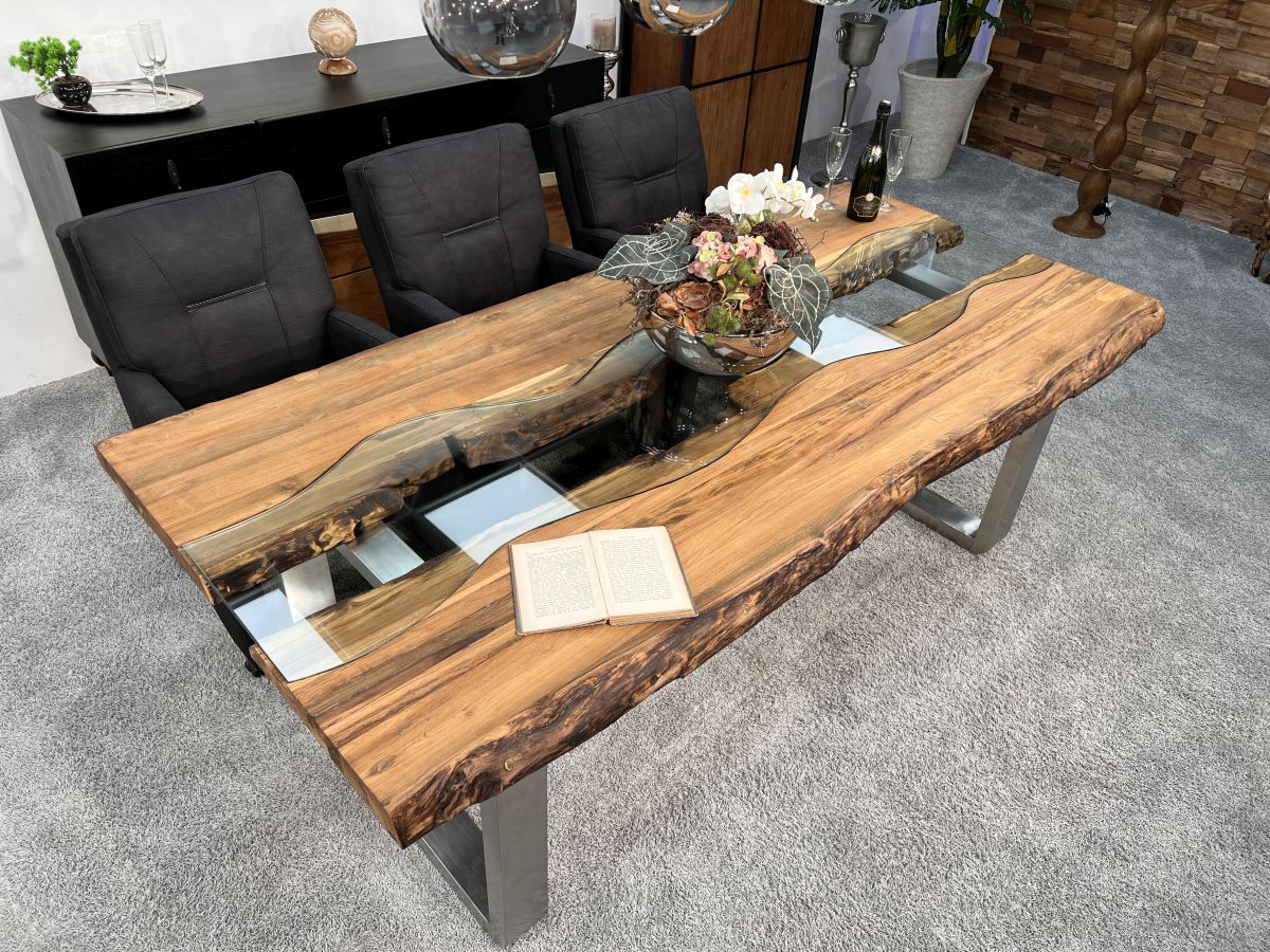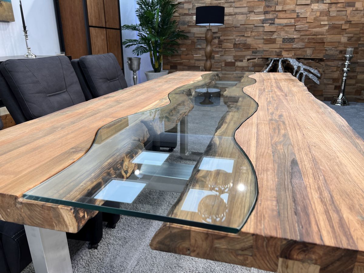 Bei diesem Esstisch handelt es sich um eine interessante Kombination aus den Rohstoffen Altholz, Edelstahl und Glas. Verwendet wurden verleimte Altholzbohlen aus Teak von den indonesischen Inseln Java und Bali. Durch die Verwendung von Altholz erhält dieser Esstisch seine ganz besondere Optik. Ein besonderes Highlight ist die Baumkante, die mit ihrer Natürlichkeit den Tisch zu einem echten Hingucker macht. Die von Hand zusammengefügte Tischplatte aus recyceltem Holz liegt auf zwei eigens angefertigten Tischkufen aus gebürstetem Edelstahl. Mittig zur Tischplatte des Esstisches wurde eine in Handarbeit erstellte Glasplatte eingelassen. Diese Glaseinlage stellt einen Fluss dar, der durch eine Landschaft fließt und sie bietet eine optimale Ablagefläche. Dadurch ist das Modell nicht nur optisch ansprechend, sondern auch sehr funktional.