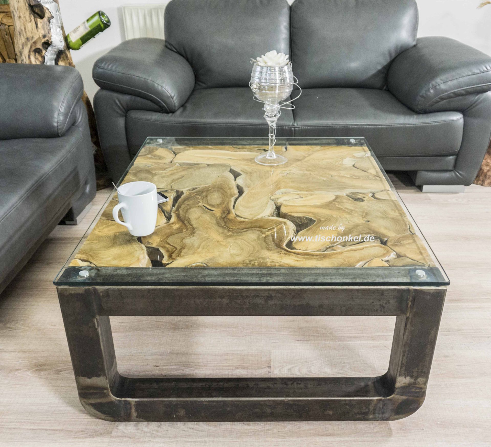 Material: Altholz (Teak Wurzelholz) mit einem Gestell aus Rohstahl mit Glasplatte