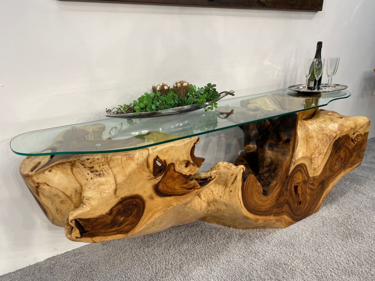 Um eine optimale Ablagefläche für Ihre Dekoration und weitere Gegenstände zu bieten, wird auf dem Sideboard eine Glasplatte montiert, die einen Blick auf das Holz ermöglicht. Die Verbindung aus rustikalem Naturdesign mit dem circa 10 mm dicken Glas machen das Modell „Valencia“ zu einem außergewöhnlichen Möbelstück. Dabei hat jedes Sideboard seine eigene Schönheit und Charakter und ist ein in Handarbeit gefertigtes Unikat.