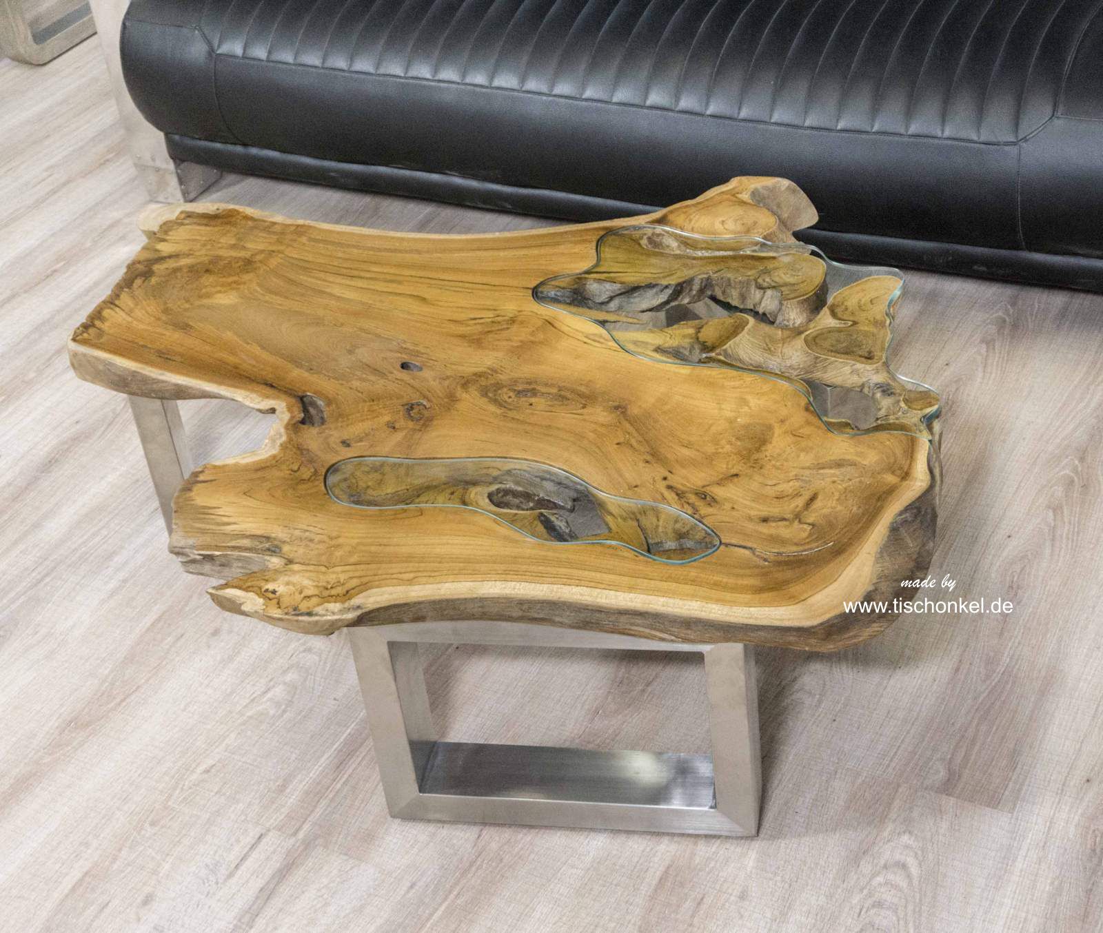 Ein hübscher kleiner Couchtisch aus Massivholz möchten wir Ihnen heute vorstellen. Die Tischplatte für diesen kleinen Couchtisch wurde aus einer Baumscheibe Teakholz gefertigt. Die kleine Baumscheibe stammt aus dem Bereich der Baumwurzel und verfügt somit über eine außergewöhnliche Struktur. So ein hübscher kleiner Couchtisch wertet auch kleine Wohnzimmer entsprechend auf und hinterlässt bei Ihren Besuchern einen bleibenden Eindruck.