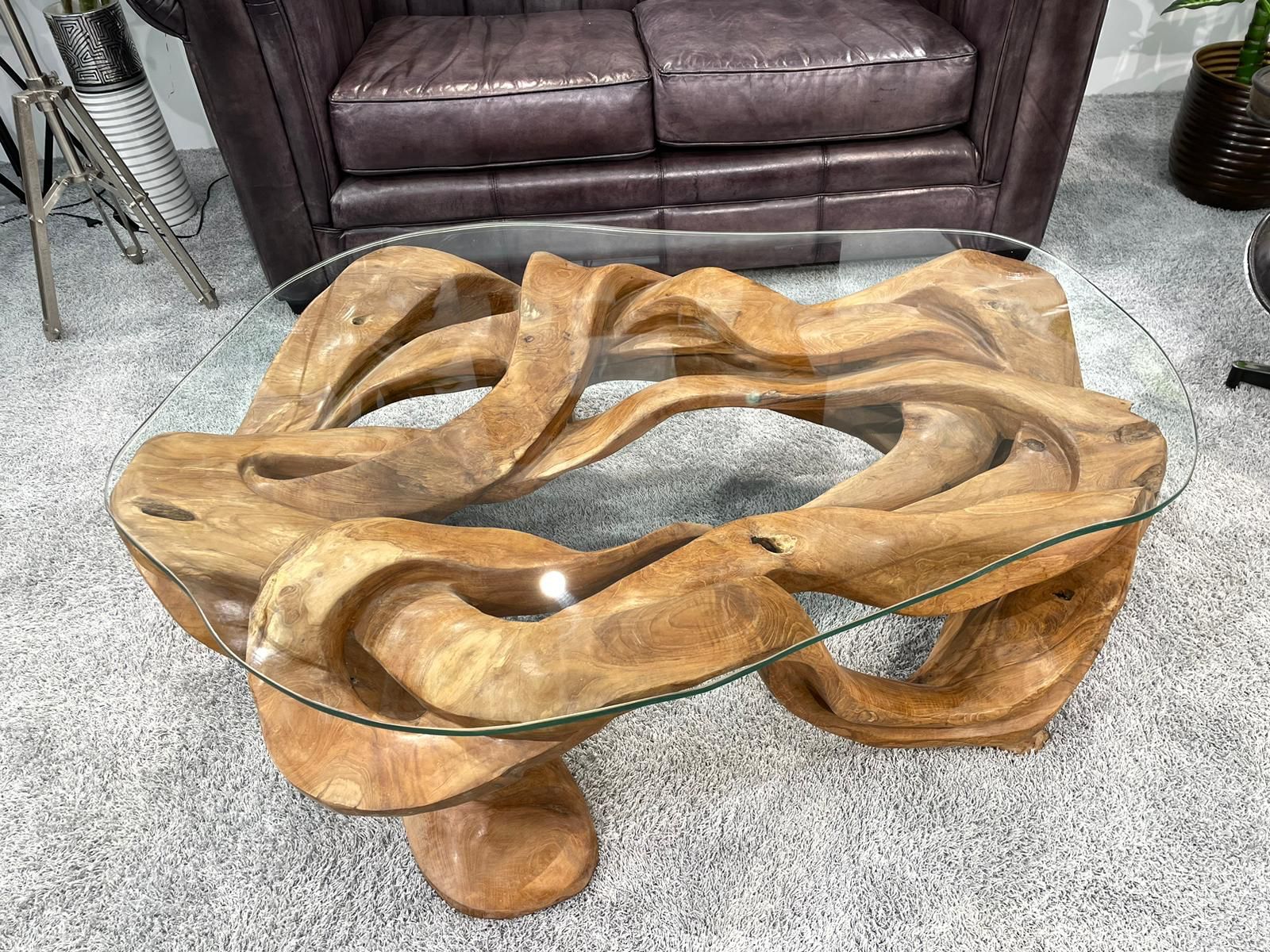 Material: Alte Baumwurzel aus Teakholz, Glasplatte