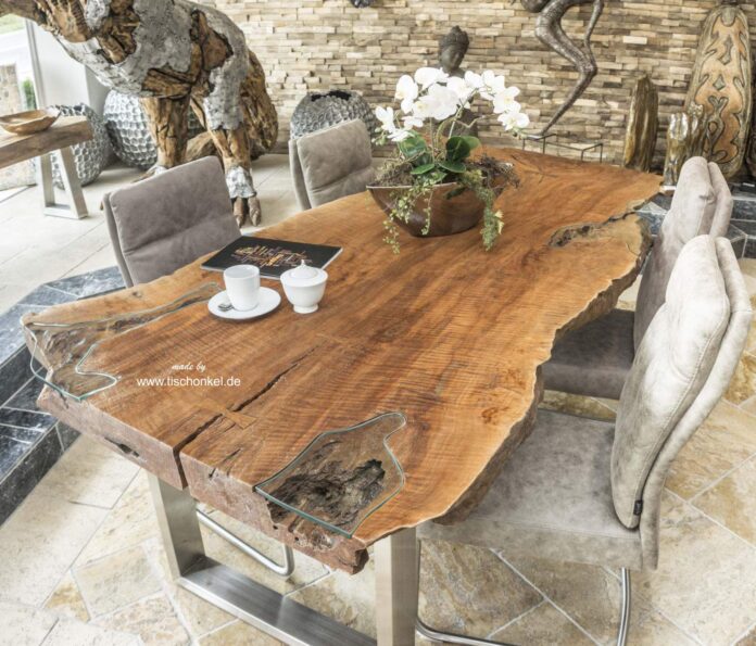 Schweres Design? Ja,…dieser beeindruckende Tisch kann als Konferenztisch oder Esstisch für die nächsten Jahrzehnte Ihr Begleiter sein. Die Tischplatte für diesen Konferenztisch hat eine kräftige Stärke von 10 cm,….die Länge des Tisches beträgt ca. 250 cm. Zur Verwendung kam bei diesem Konferenztisch eine massive Bohle aus Litschi, einem sagenhaft harten Holz mit einer einzigartigen Struktur, welche an edles Wurzelholz erinnert. Die im Baumstamm natürlich gewachsenen Löcher haben wir zusätzlich mit kleinen Glasplatten verzieren lassen