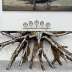 Einrichtungsidee für eine Konsole aus einer Baumwurzel ROOTS mit interessanter Verzierung aus Aluminium