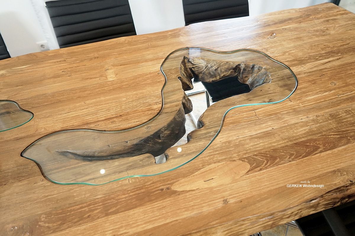 Zur Anwendung kamen 400 cm lange massive Bohlen aus recyceltem Teakholz. Die Oberfläche der Tischplatte wurde in Handarbeit gebürstet und aufwendig mit einem hochwertigen Möbelwachs eingelassen. Der Konferenztisch steht auf zwei Tischbeinen in Kreuzform, welche ebenfalls in Handarbeit aus gebürstetem Edelstahl gefertigt wurden. Ein Besprechungstisch mit diesen Ausmaßen beeindruckt die Teilnehmer Ihrer Konferenz und bleibt in Erinnerung.