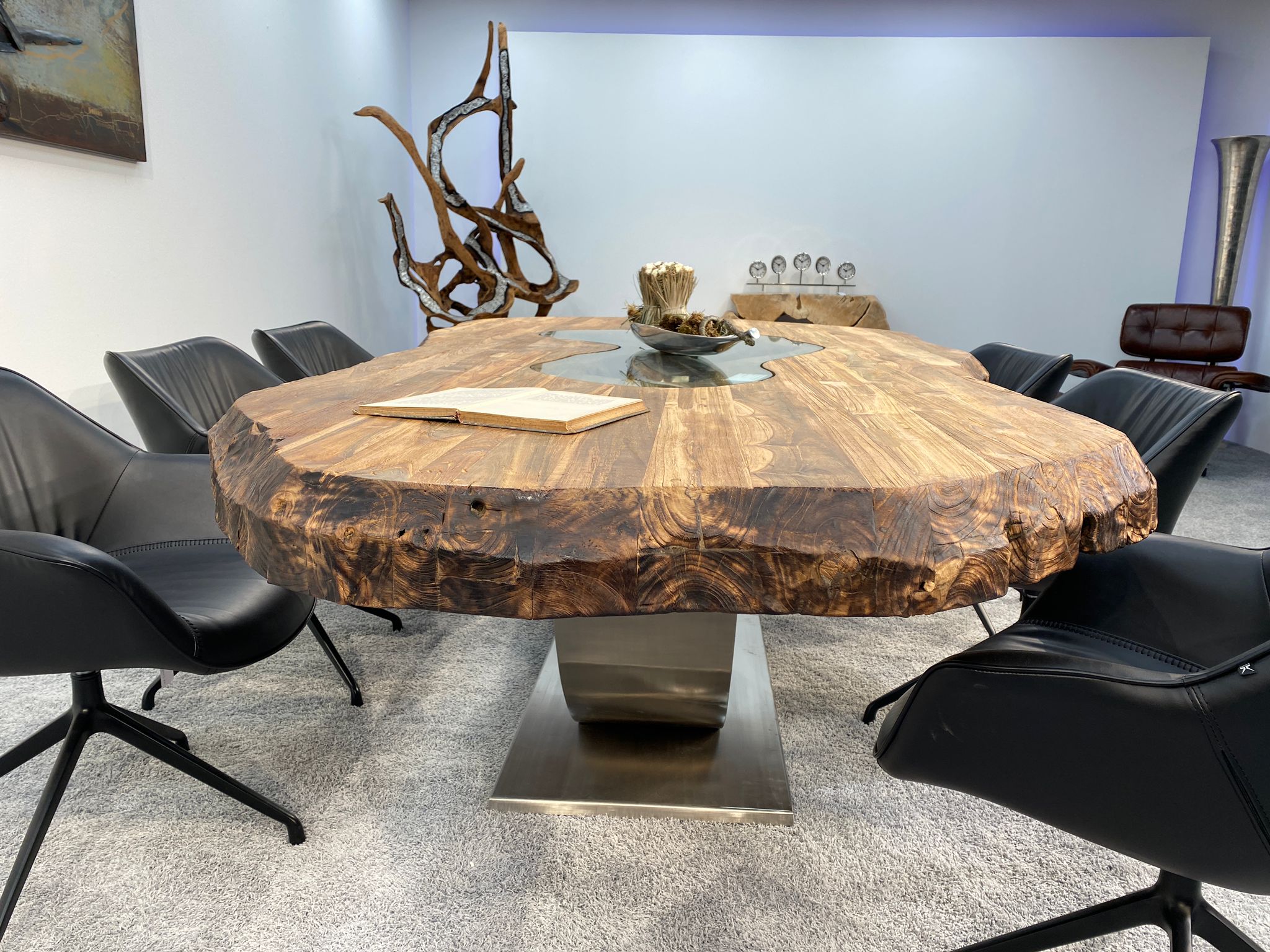 Ein beeindruckender massiver Esstisch ist der Esstisch „Fusion“ aus recyceltem Holz. Seine ca. 10 cm massive Tischplatte wurde aus massiven Holzbohlen gefertigt und mittig mit einem interessanten Glaseinleger versehen. Die Tischplatte steht aus einem Tischfuß in Form eines Halbmondes aus gebürstetem Edelstahl.