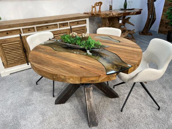 Ein weiteres Highlight auf der Wunschliste unserer Kunden ist der runde Esszimmertisch ETERNIA. Dieses Esszimmertisch-Modell überzeugt Dich mit seiner 6 cm starken, runden Massivholzplatte und einem zusätzlichen Design-Highlight. Die Tischplatte wurde mit einem handgefertigten Glaseinleger verziert, die nicht nur den Blick in das Altholz ermöglicht, sondern die massive Bauart der Platte hervorhebt. Der Glaseinleger stellt den Verlauf eines Flusses dar und verschafft damit der klaren Linie aus Massivholz einen organischen Designstil. Das Tischgestell in Kreuzform steht in unterschiedlichen Materialien zur Verfügung. Du wählst beim Tischgestell zwischen modernem gebürsteten Edelstahl, oder rustikal wirkendem Rohstahl im Industriedesign.