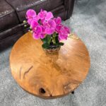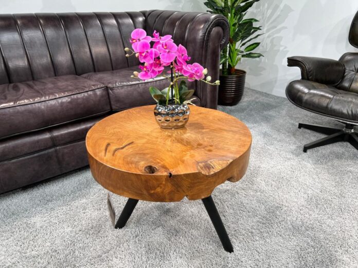 Materialien: Baumscheiben Teak aus dem Bereich der Baumwurzel, drei Tischbeine in V-Form aus schwarz matt lackiertem Rohstahl